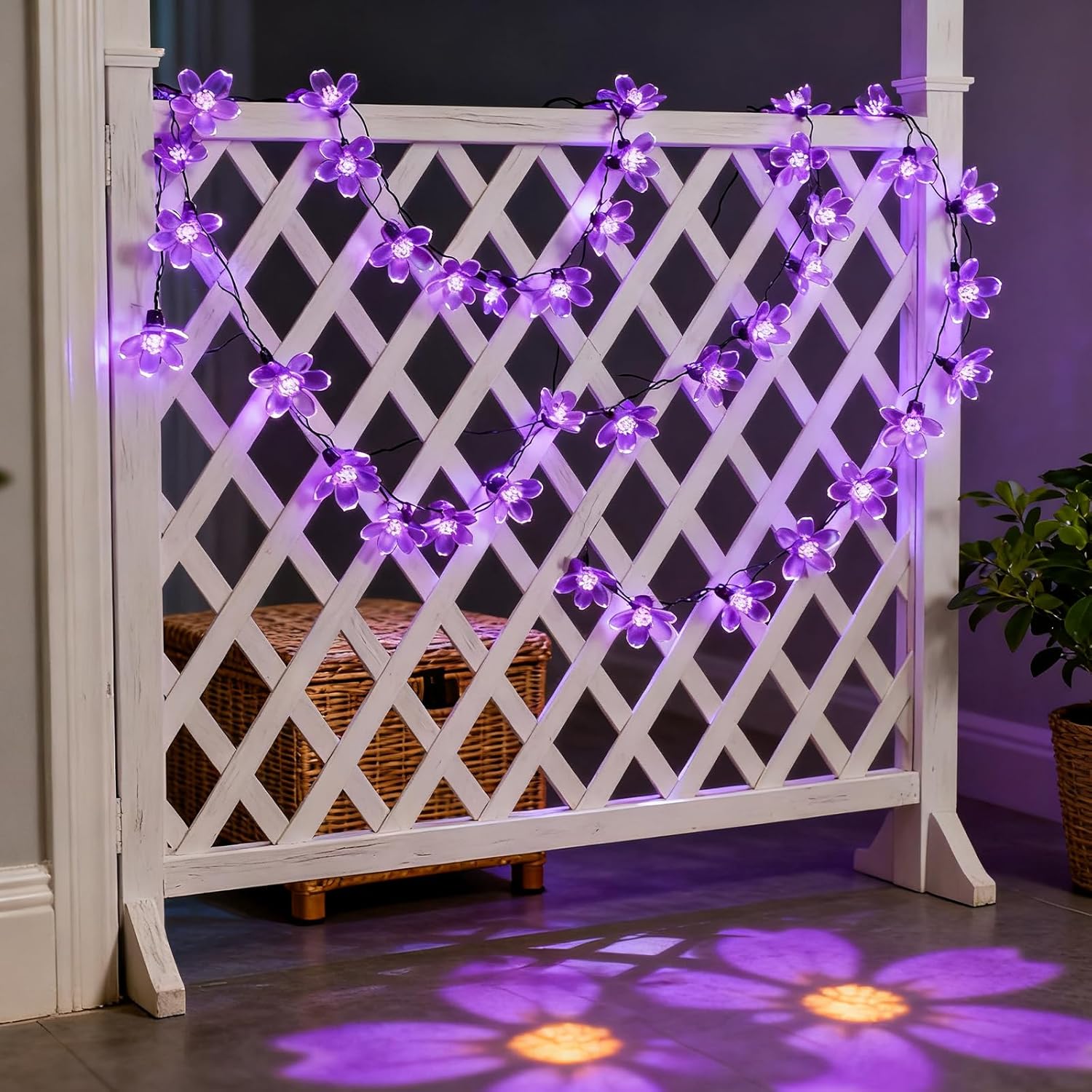 - [Romantic Fiary Flower Lights Decor] : This beautiful artificial cherry blossom flowers with lilac light can well decorate home, office, restaurant, garden, bedroom, kid's room, living room, reading room, balcony, window, patio, porch, gazebo, yard, fence, wall, roof, ceiling, garden, tree when Christmas, Ramadan, New Year, parties, birthday, wedding, dinner, Thanksgiving Day, Easter, Halloween, valentine’s Day, holiday festival decor. It will Light up the night with a warm glow and perfect to add ambience.