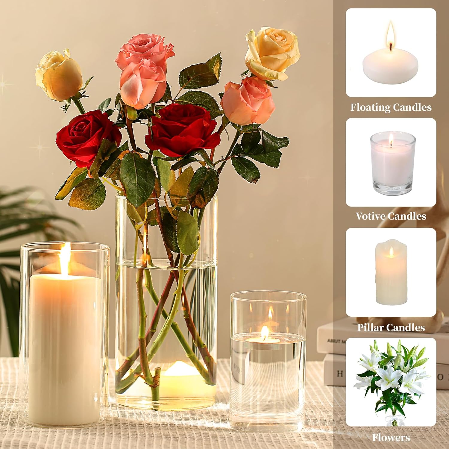 - 3 Different Sizes Candle Holder: The set glass candle holder includes 3 different size¡ªLarge Size: width 4.7'' x height 10'', Medium Size: width 3.9'' x height 7.8'', Small Size: width 3.3'' x height 5.9'', each size 8 pcs, It can be used as a pillar candle holder, floating candle holder, and vase for flowers, which is the ideal choice for modern home decoration