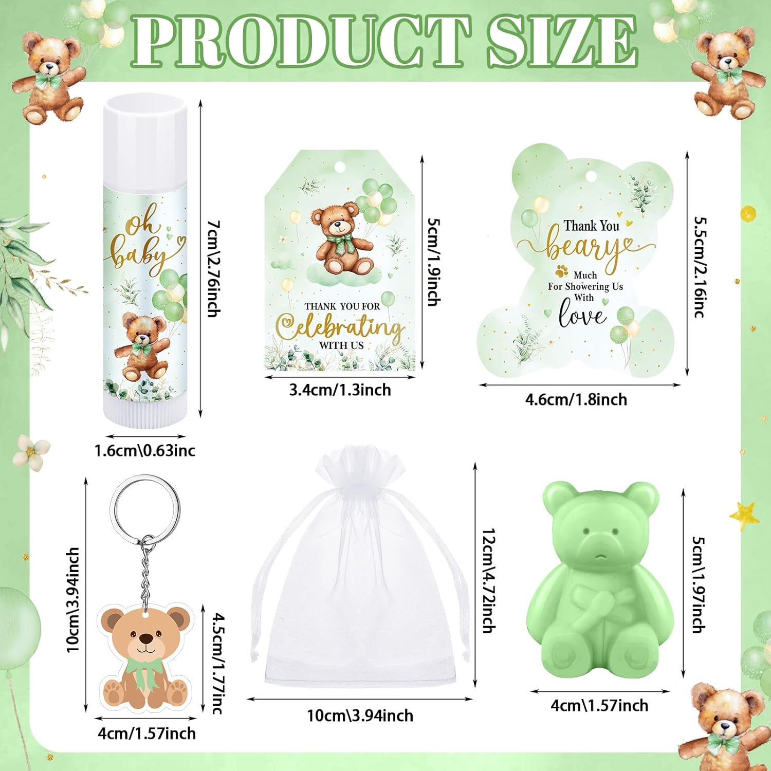 - Appropriate Sizes for Sharing Warmth: the bear soap and lip balm pieces are about 1.97 x 1.57 inches and 2.76 x 0.67 inches, respectively; Additionally, the thank you tags measure about 3.15 x 2.17 inches, organza bags measure about 4.72 x 3.94 inches, and bear shape cards are suitably sized about 3.35 x 2.76 inches to hold these baby shower gifts bulk; You can also write down messages on the cards to personalize your appreciation