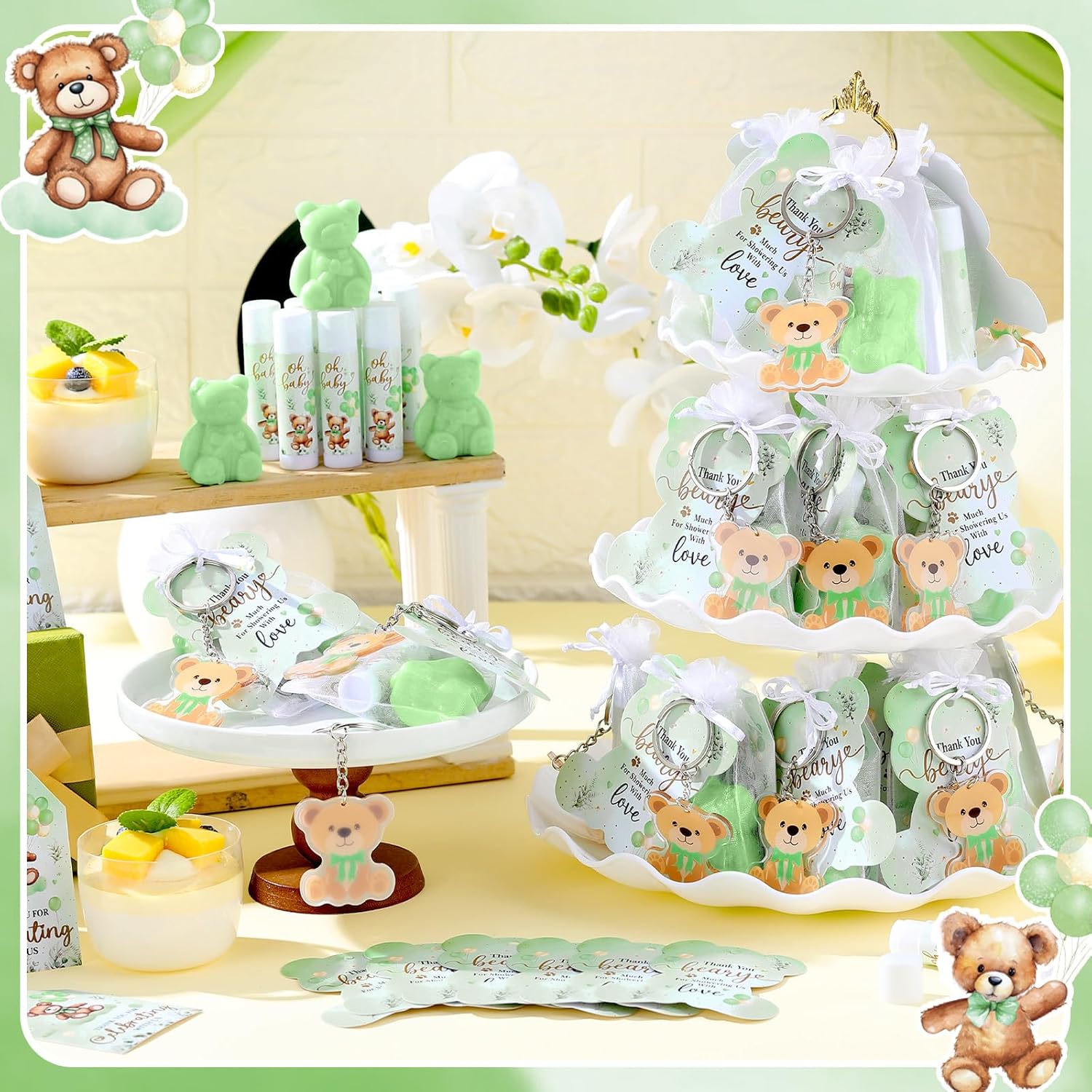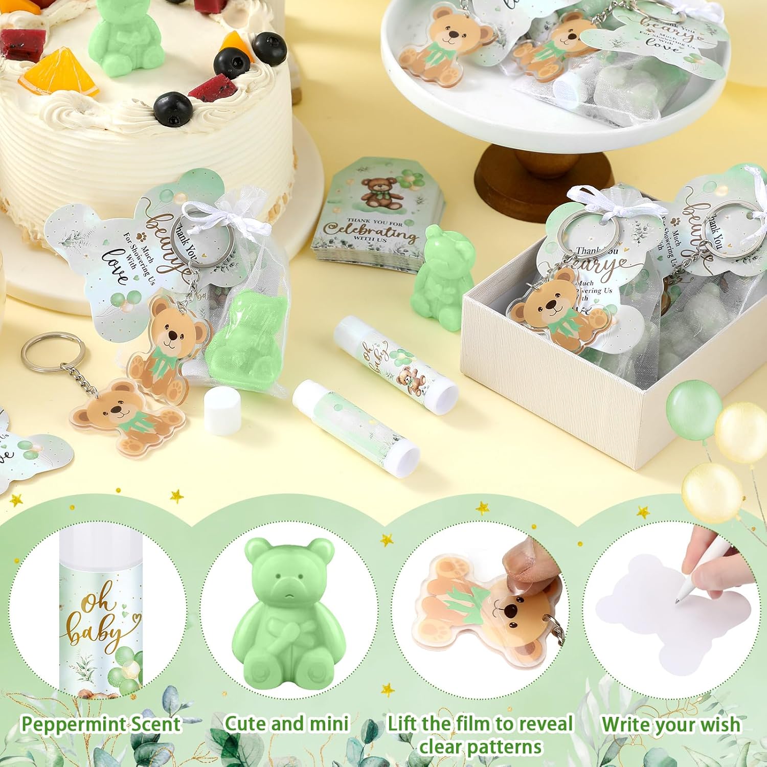 - Complete Baby Shower Favor Sets: enjoy a comprehensive baby shower favors set that are suitable for a baby shower; Each package includes 48 lip balms, 48 bear shaped soaps, 48 bear keychains, 48 organza bags, 48 thank you tags, and 48 bear shaped cards; These can be individually packaged in organza bags alongside a thank you tag, offering a sophisticated and heartfelt gesture to appreciate your guests