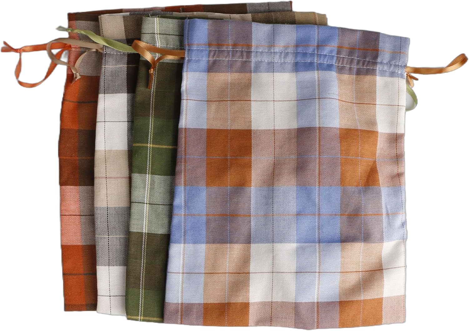 Large Fall Burlap Bags with Drawstrings - Orange Buffalo Plaid, Sage Green Gingham - Reusable Brown Pouch for Thanksgiving Party Gift Wrapping Goodies (4 colors, 6x8 inch)