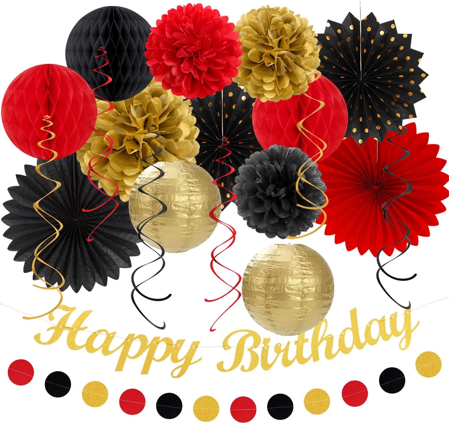 - 【Red Black Glod Party Kits】This kits include: 1pcs happy birthday banner,1pcs circle dots paper banner, 4pcs tissue pom poms: 3pcs 10" and 1pcs 12" in three color, 3pcs 8inch paper honeycom ball, 2pcs 8inch paper lantern, 4pcs 12inch paper fan, 6pcs Paper ribbon in two color(more packing details show in the package picture).