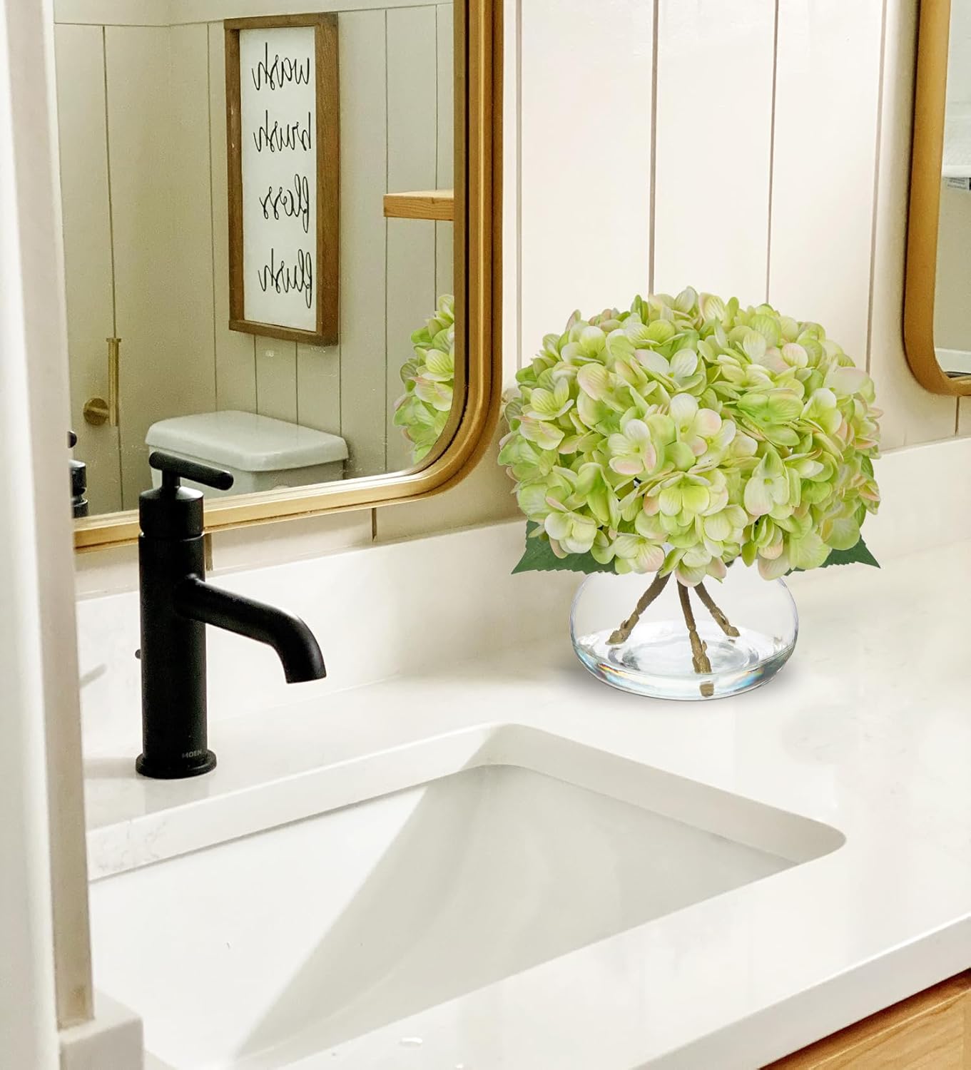 Hollyone Hydrangea Artificial Flowers with Glass Vase Green Silk Faux Flowers Arrangements in Vase with Faux Water Fake Floral Bulk Bouquet for Home Decor Table Centerpiece Decorations