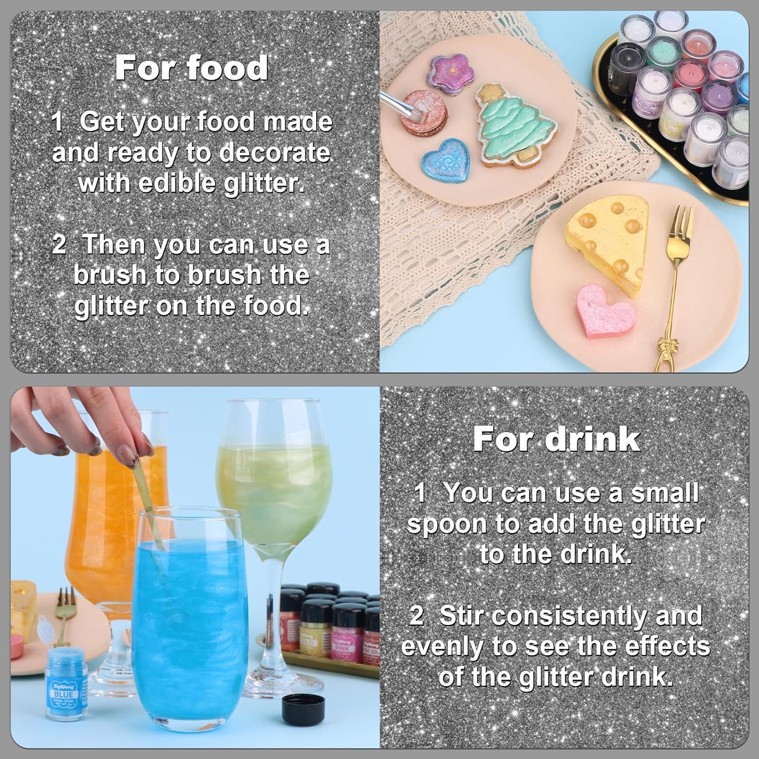 - 【Edible Glitter】: We offer edible glitter in a variety of colors, so you can match them to your party theme or personal preference to add a gorgeous shine to your drinks or baking!