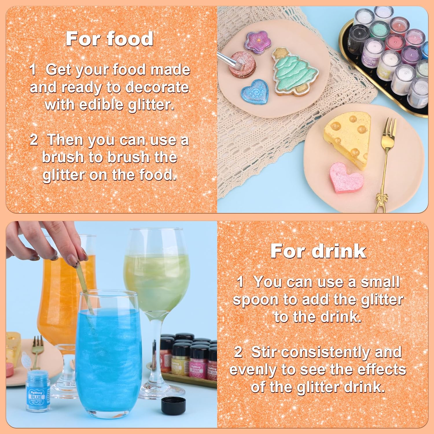 - 【Edible Glitter】: We offer edible glitter in a variety of colors, so you can match them to your party theme or personal preference to add a gorgeous shine to your drinks or baking!