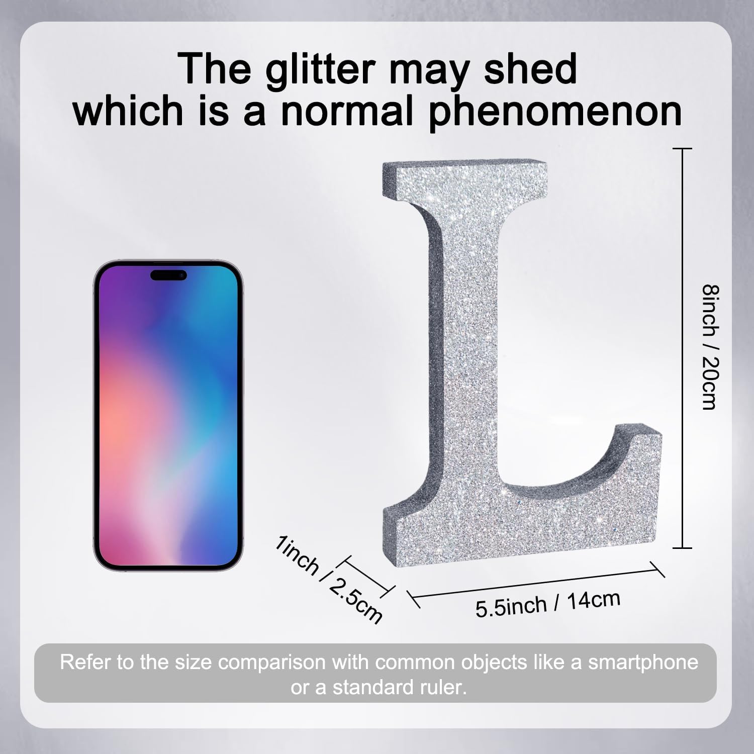 - ITEM INFORMATION AND SIZE: 1 Pcs * L Silver Glitter Letter Ornament. Size: 8 * 5.8 * 1 Inches (20*15*2.5 CM). Before purchasing, Please check the size carefully to make sure it meets your needs