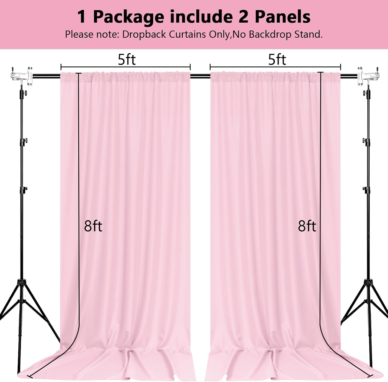 - DIMENSIONS: Each order is for 2 (two) polyester curtains. Each curtain measures 5 feet wide x 8 feet high. Entire backdrop measures 10 feet wide x 8 feet high.Each curtain panel comes with 4 inch rod pocket on top, fit up to any standard rods. (Please note: Dropback Curtains Only,No Backdrop Stand.)