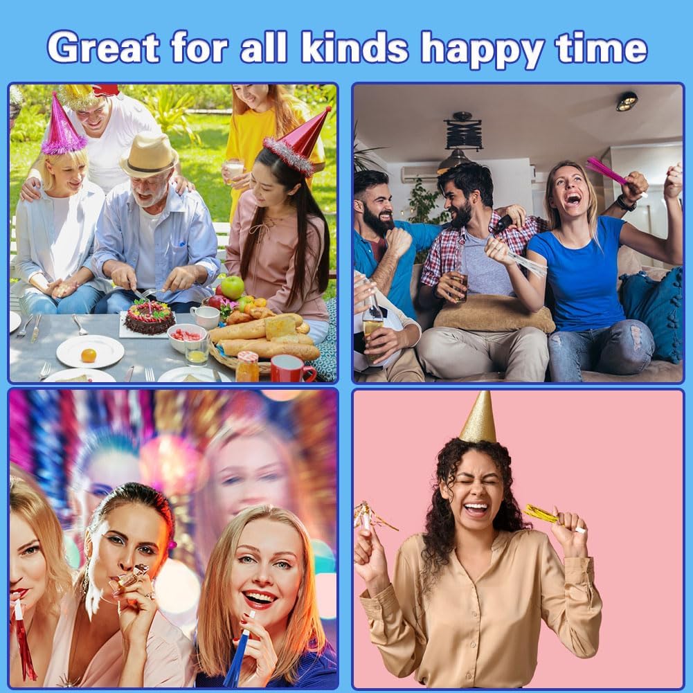 - RELIABLE MATERIAL:The blow horn noise maker is made of quality plasitc and bright foil paper; Safe with smooth surface and fine workmanship; Please gently open the packaging