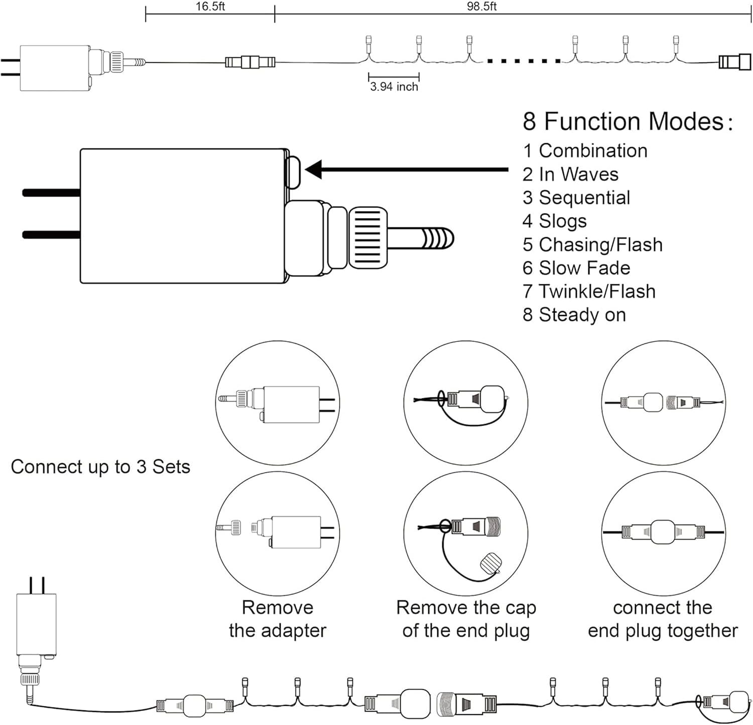- 8 Lighting Functions with Memory Function: Our Christmas string lights have 8 lighting modes- combination, in waves, sequential, slogs, chasing/flash, slow fade, twinkle/flash, and steady on. Just pressing the round button on the transformer to change the lighting modes. Comes with memory function, will remember last setting automatically after cutting off the power, no need to reset again