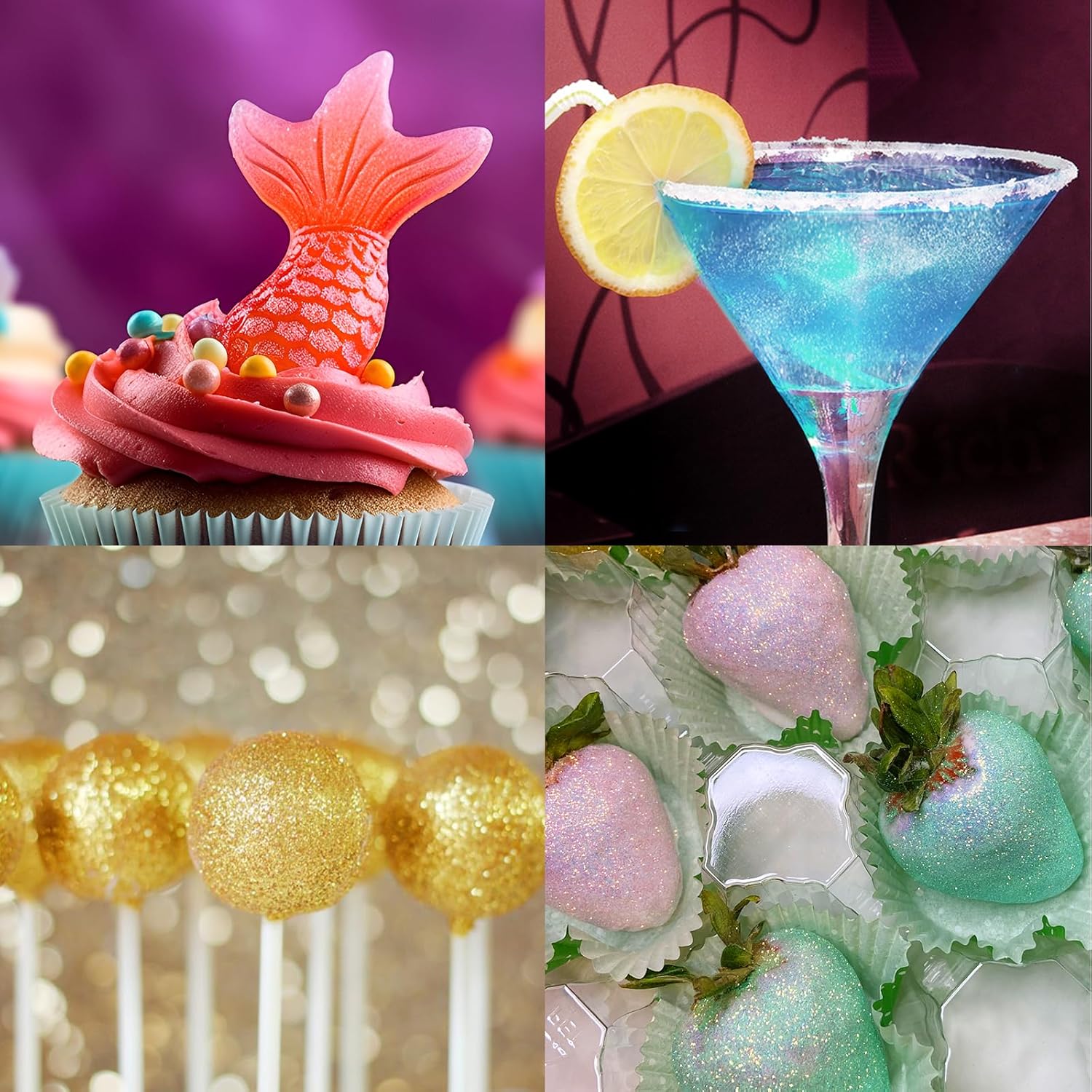 - Widely Use: This edible glitter can be used for a various beverages and wines, cocktails,champagne, gourmet cakes, cupcakes, cookies, mcaroon, dipped strawberries, chocolates, cake pops, Ice-cream, etc...other baked goods by giving them amazing color and sparkle.