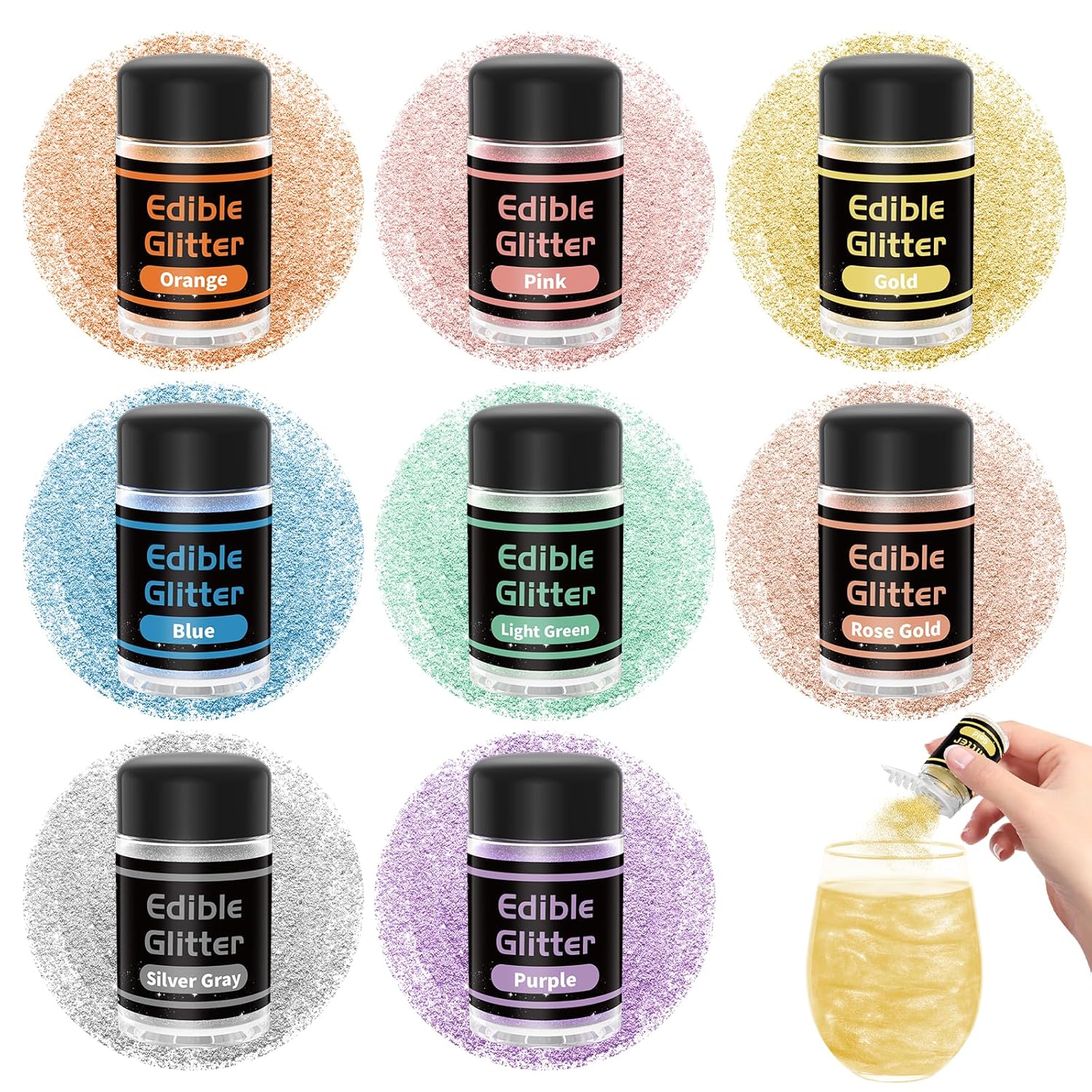 - Edible Glitter Set Contains: Light green, pink, rose gold, orange, gold, blue, purple, silver grey, 8 colors, 3 g/bottle.