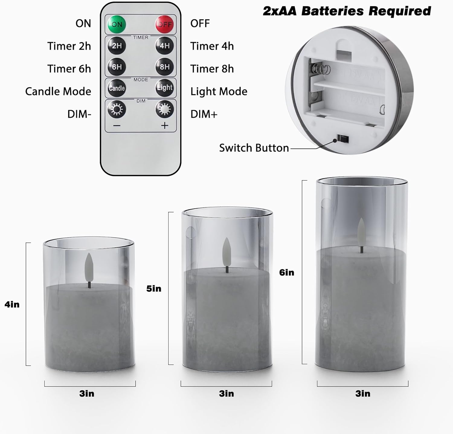 - 【Grey Flameless Candles】When these realistic flameless candles flickering, the light of the 3D wick is warm white, the bright candlelight passes through the grey glass, reflecting beautiful light and shadow, showing a warm and romantic atmosphere, which is very suitable to be a gift for wife, girlfriend, and friends. - Set of 3 with the size of 3'' in diameter, 4''/5''/6'' in tall.
