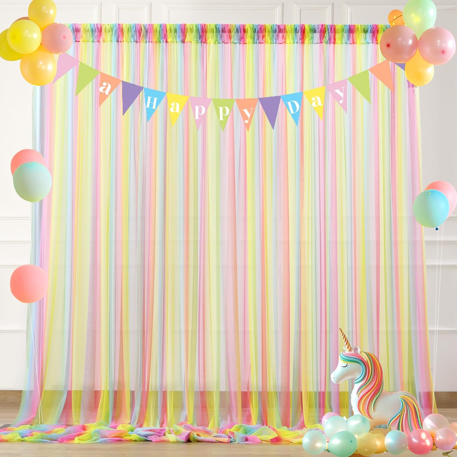 - Rainbow party backdrop curtian easy to mount : With rod pocket across the top for easy hanging on a pipe or stand. Avoid sharp items or the tulle curtain may be damaged.