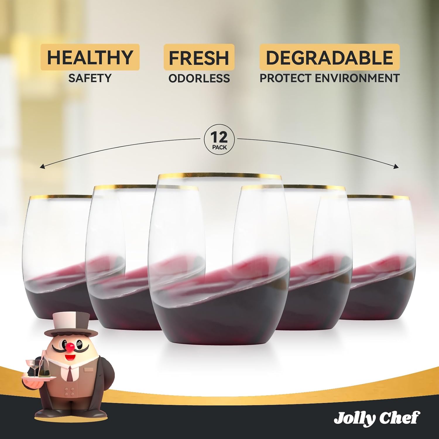 JOLLY CHEF 12 Pack 12oz Gold Plastic Wine Glasses Stemless, Gold Disposable Wine Cups, Premium Quality, Recyclable, Unbreakable, Crystal and BPA-Free for Party