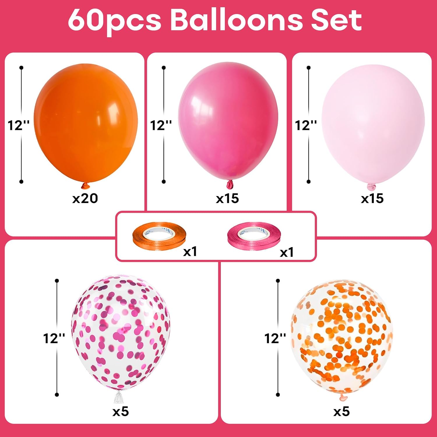 - 🎈 Orange Hot Pink Balloon Includes: You will get 60 pack pink and orange latex balloons, all sized 12 inch, including matte orange balloon (20 pcs), fuschia pink balloons (15 pcs), pastel pink balloons ( 15 pcs), orange confetti balloons (5 pcs), hot pink confetti balloon (5 pcs) . Orange balloon ribbon * 1 pc, pink balloon curling ribbon * 1 pc. With perfect size and classical collocation, globos rosados will increase lots of fun to the pink and orange party decorations!
