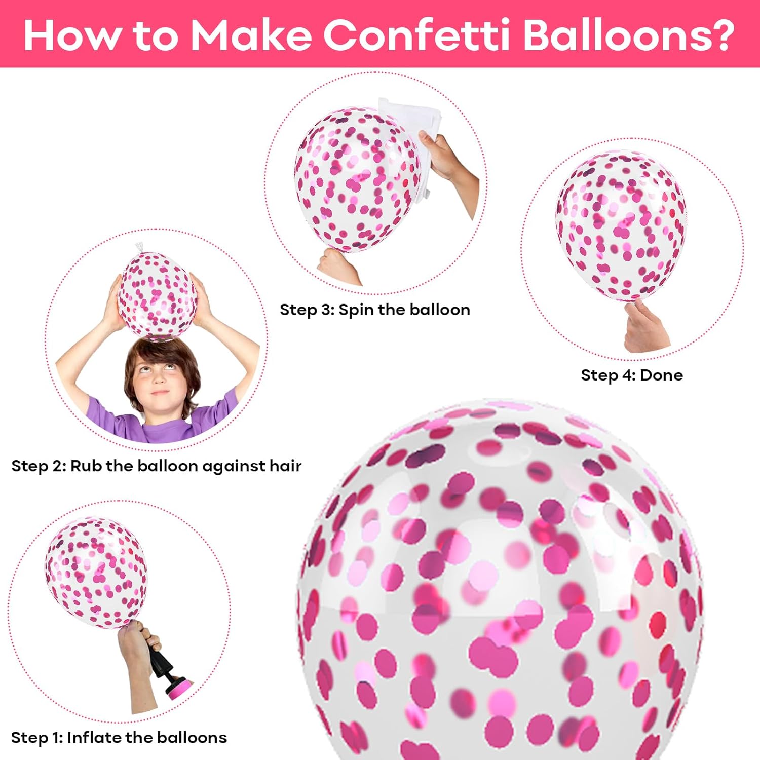 - 🎈 How to make Glitter Balloons Confetti: For your convenience, our pink glitter balloons are pre-filled with sparkly confetti. After blowing up the magenta confetti balloons, you can just rub the pink birthday balloons for girls on your hair, towel or something similar to help the confetti stick to the balloon easily. Create a romantic scene at your party as you pink sprinkle confetti balloons all over the place, then enjoy your happy time.
