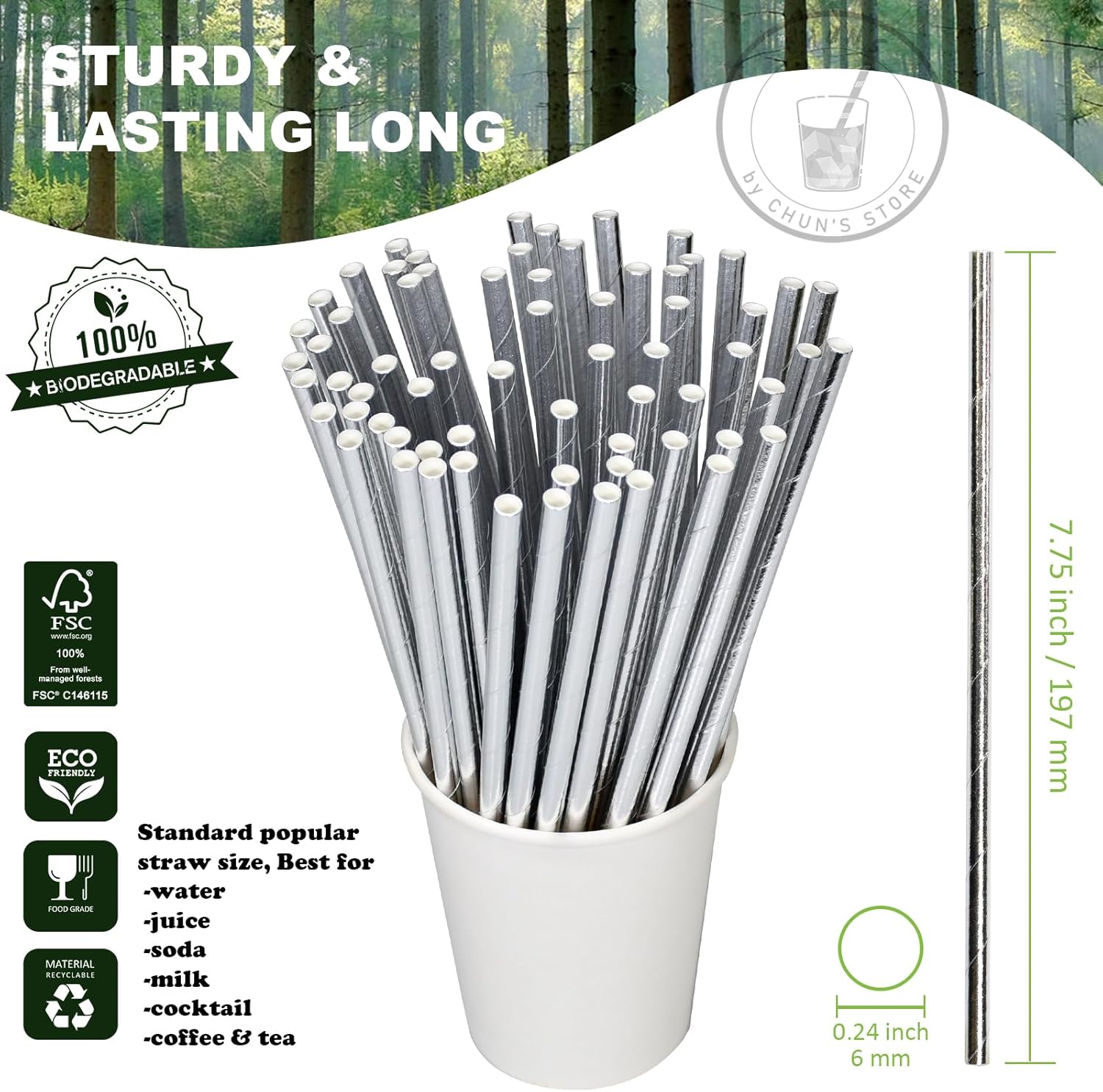7.75 inch Disposable Silver Paper Straws 1000 Counts - for Drinking, Cocktail, Bar, Restaurant, Party, Wedding