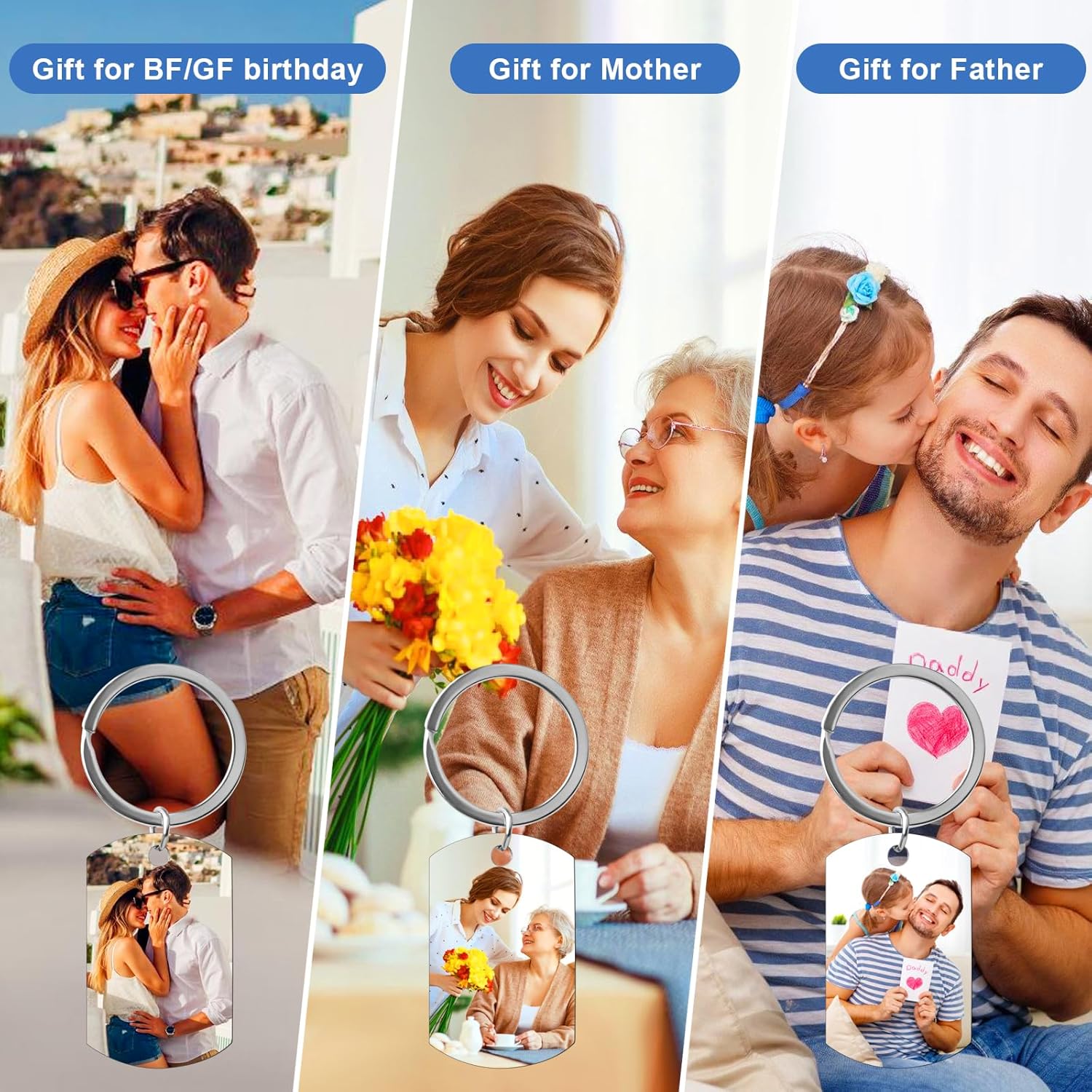 - Double-Sided Custom Keychain With Photo and Text: Crafted from premium stainless steel, this keychain is designed to hold cherished memories. Upload your favorite picture, whether it's from a personal album, graduation, or a family gathering, on the front. Add text, names, dates, or numbers to the back to convey your affection for your loved ones, including your girlfriend, boyfriend, wife , husband, parents, and friends