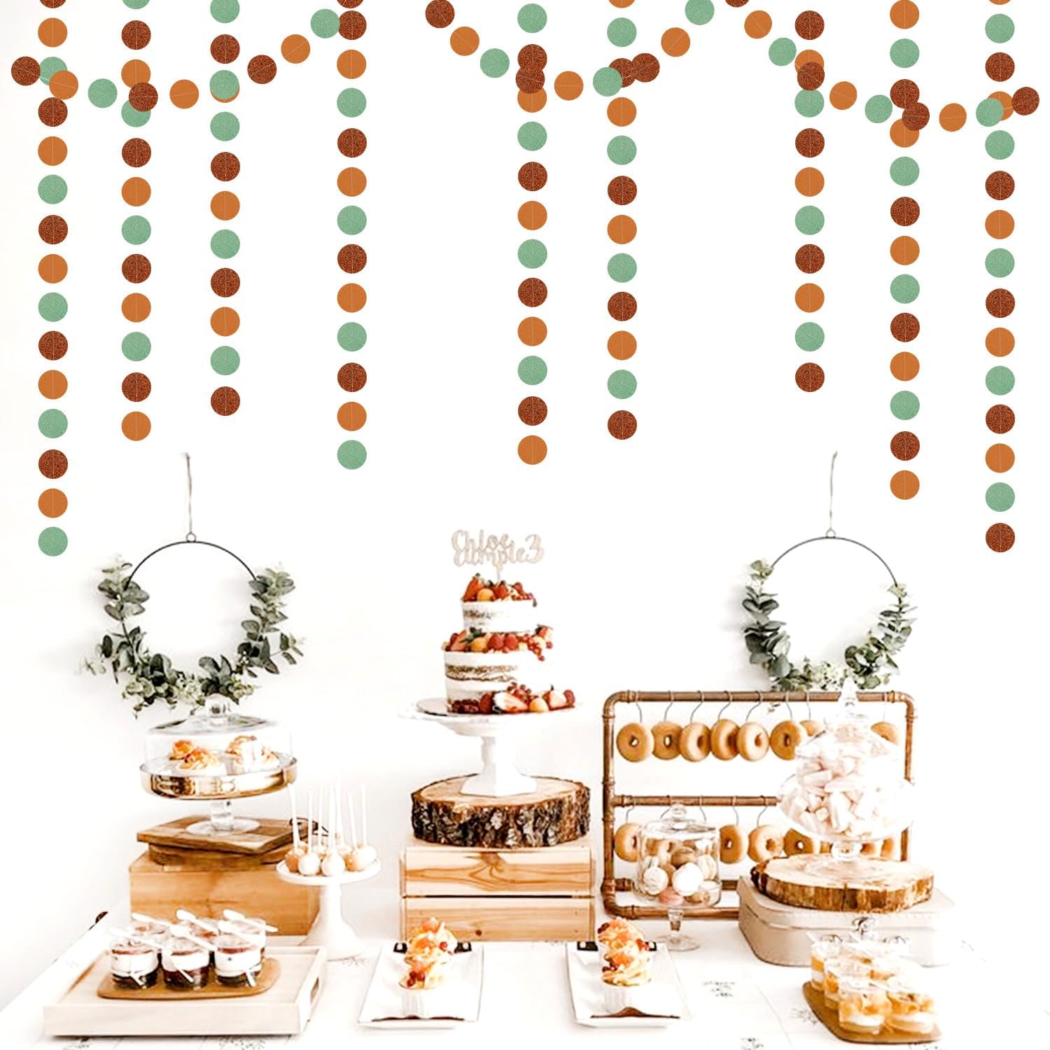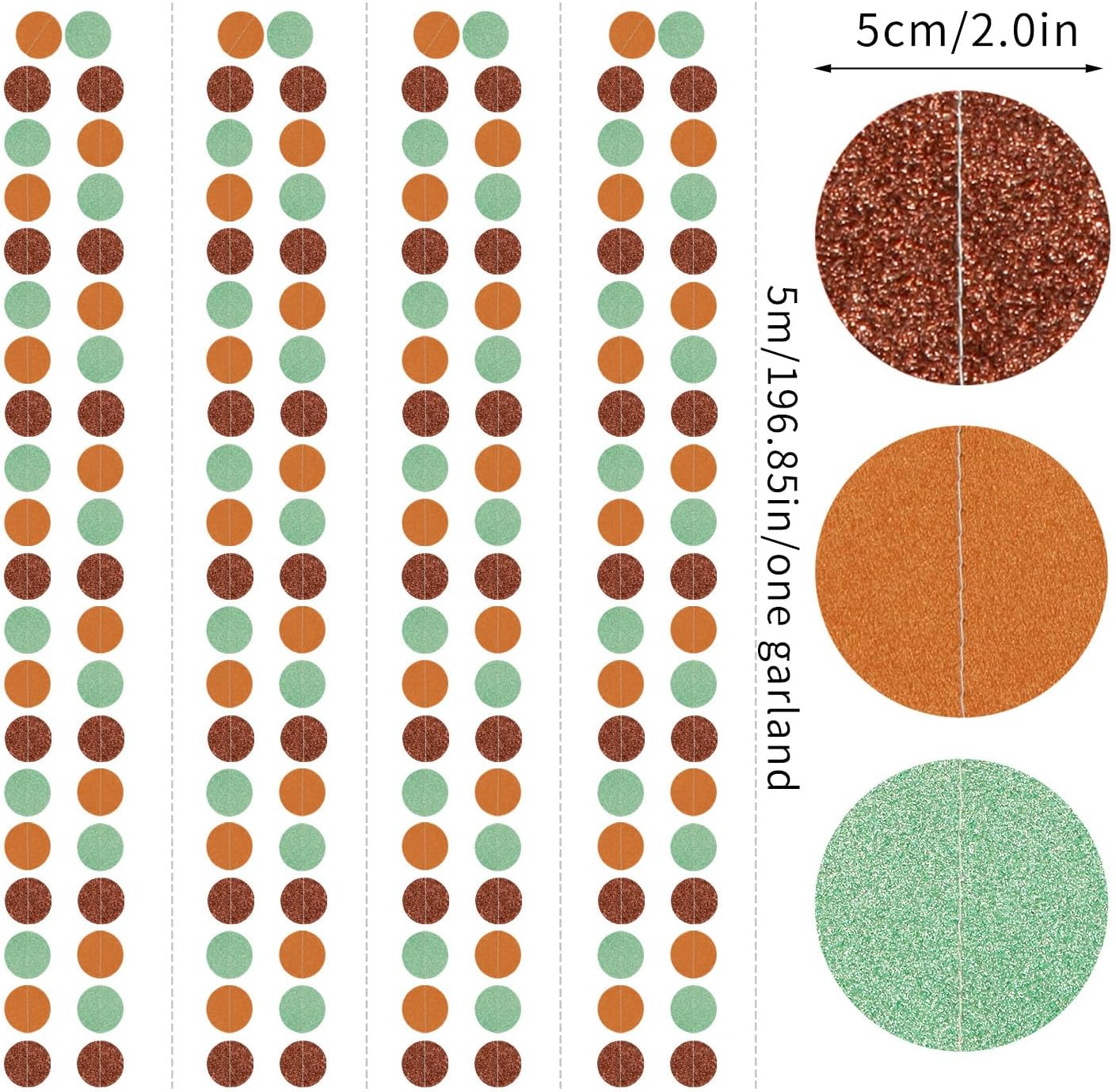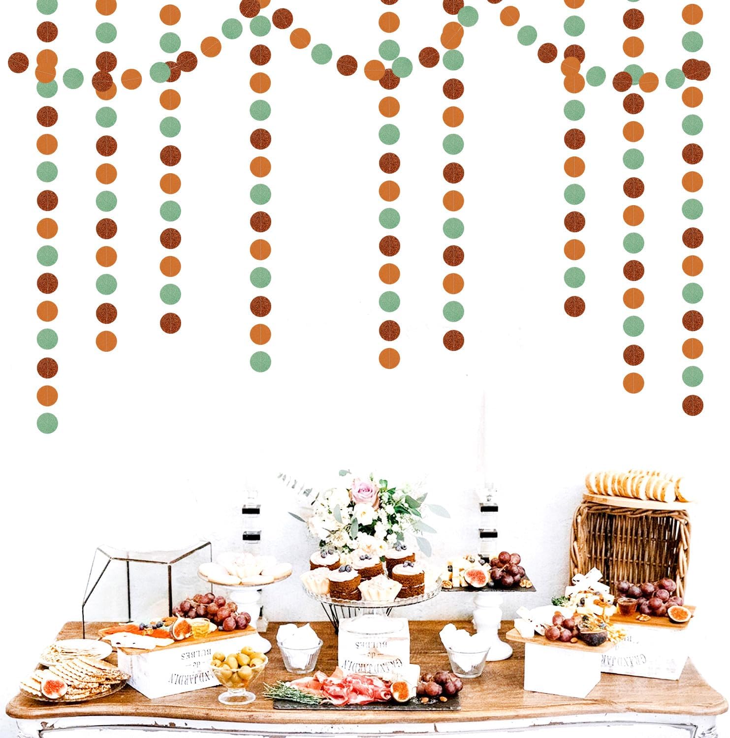 - 【Sage Green Brown Party Decorations Kit Includes】The party garlands includes 4pcs paper garlands, each backdrop bunting is 13 feet/ 4 meters long, total length is 52 feet/16 meters. Every Banner has 40pcs dots which the size is 2".