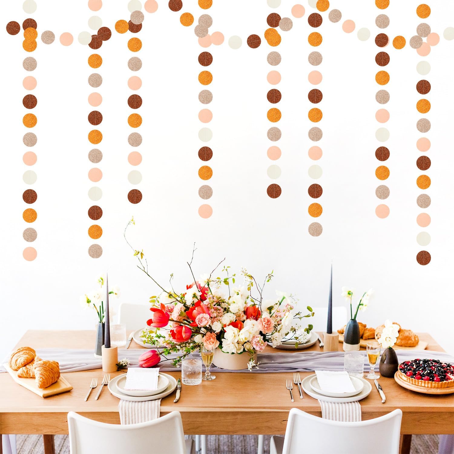 - 【Orange Brown Rose Gold Party Decorations Kit Includes】The party garlands includes 4pcs paper garlands, each backdrop bunting is 13 feet/ 4 meters long, total length is 52 feet/16 meters. Every Banner has 40pcs dots which the size is 2".
