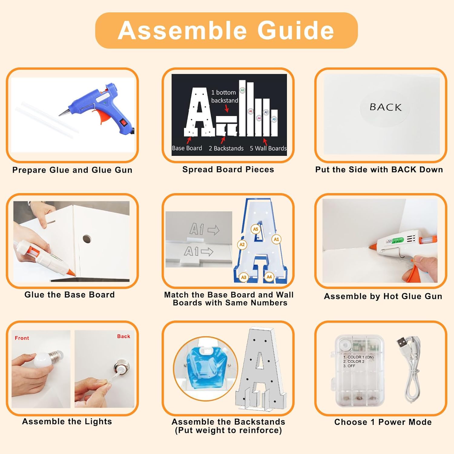 - Easy Assembling Procedure: Pre-cut frame marquee letters are easy to set up: 1) Glue the base board and match the base board and wall boards according to same letter. 2) Glue the base board and wall boards together. 3) Screw the bulbs into the board, connect LED lights and power on. (Noted: Glue gun, glue and batteries are not included) Let the installed marquee letters light up every scene you need!
