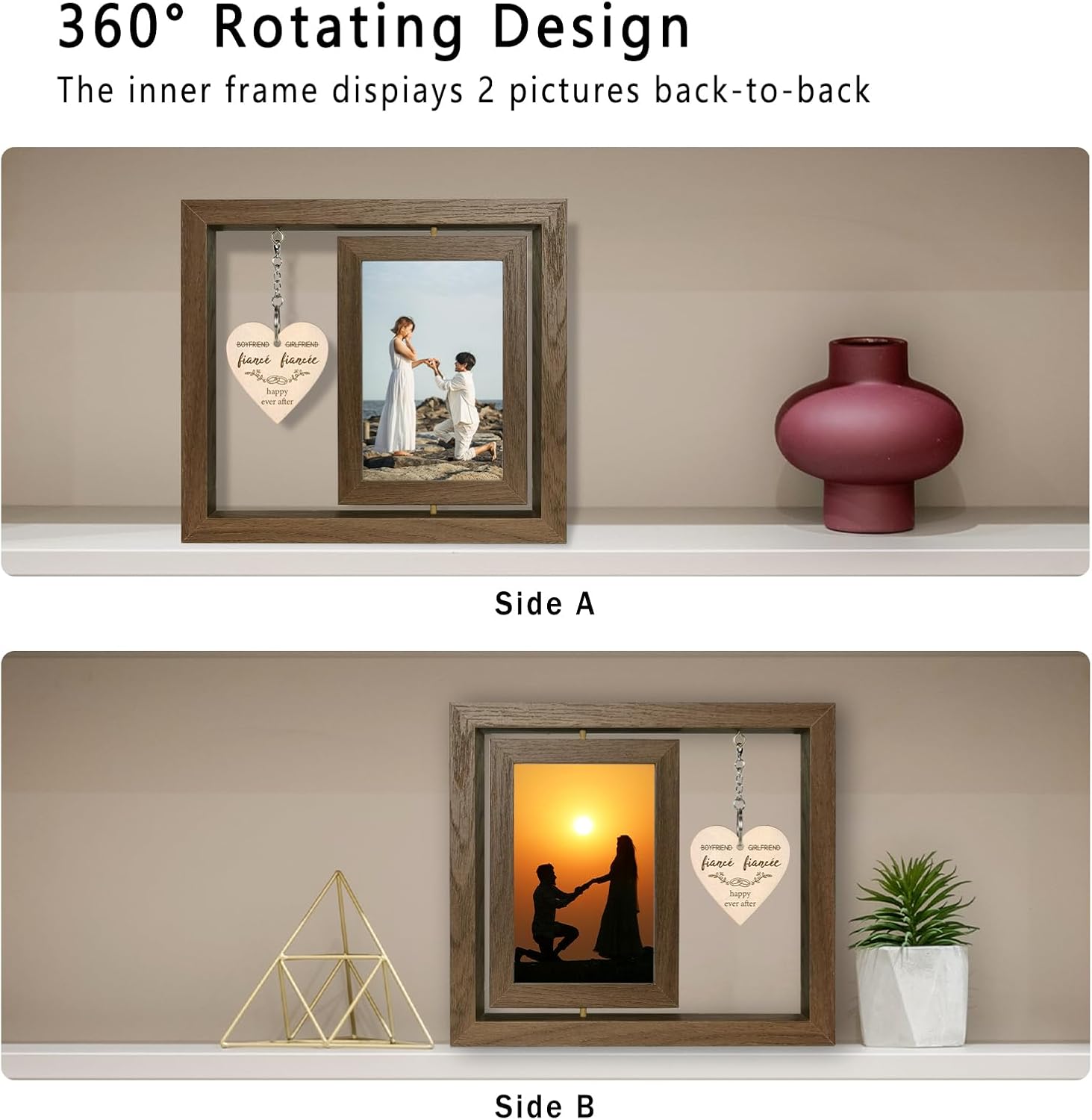 - Sturdy Wood Material: 360 Degrees rotating floating picture frames are made of lightweight wood with a unique design vintage wood texture finish and real glass cover, making a quality engaged gifts that enlightens & inspires life
