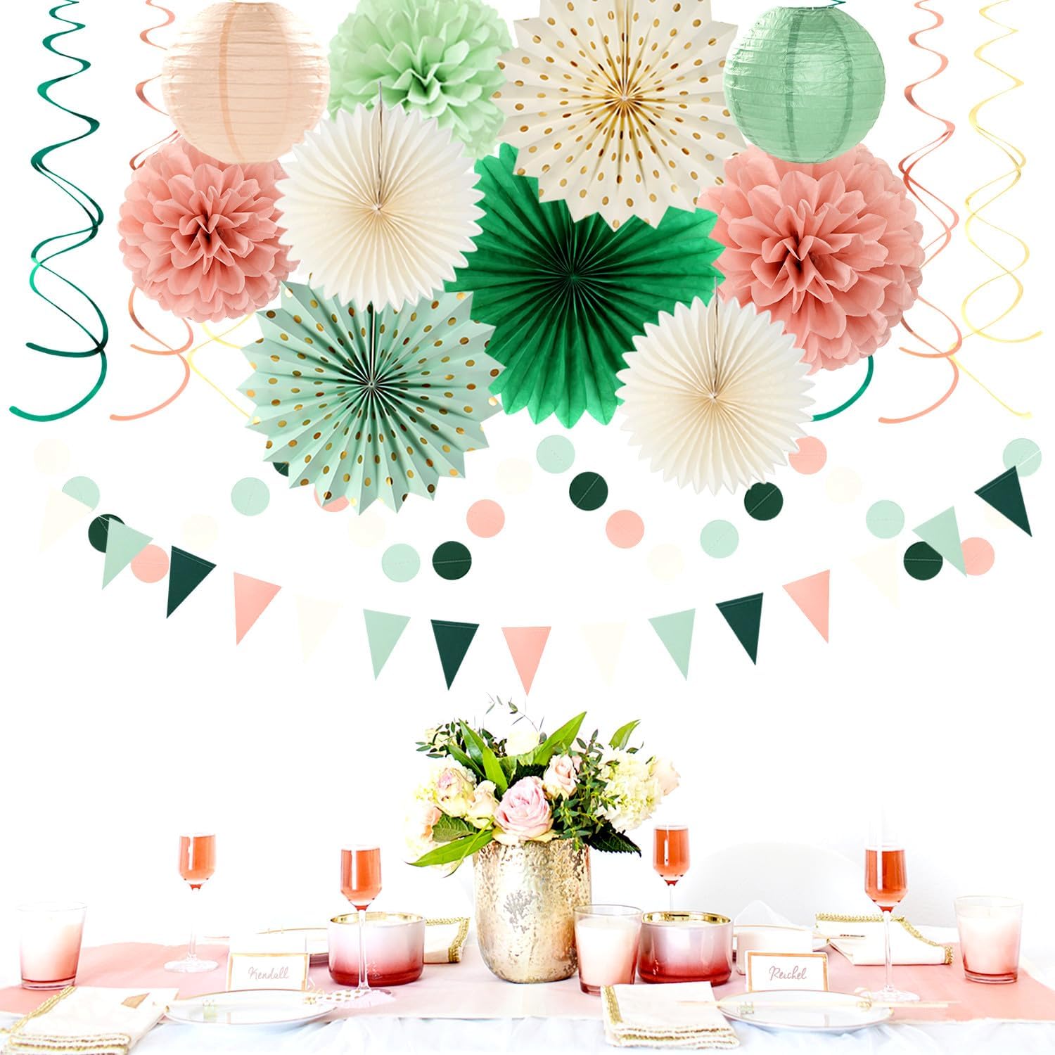 - Package Including:The sage-olive green pink-beige party decorations 1pcs paper garland dots,1pcs Triangle Flags in three color,15pcs tassel garland in four color,2pcs 8” paper lantern,6pcs streamers in two color,2pcs 10” paper lantern fan,2pcs 10” honeycomb ball in two color,1pcs 12” honeycomb ball,2pcs 12”paper lantern fan,1pcs 16”paper lantern fan.