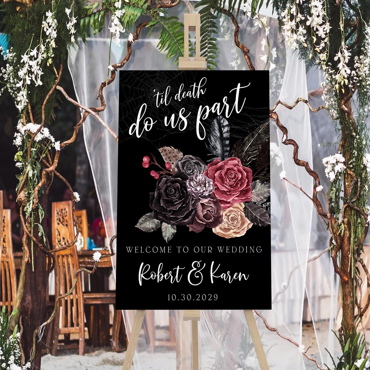 - A stunning choice for those planning a Gothic-inspired wedding or a Halloween-themed celebration. Whether you're exchanging vows on All Hallows' Eve or simply love the allure of Gothic aesthetics, this welcome sign will captivate your guests and make a bold statement.