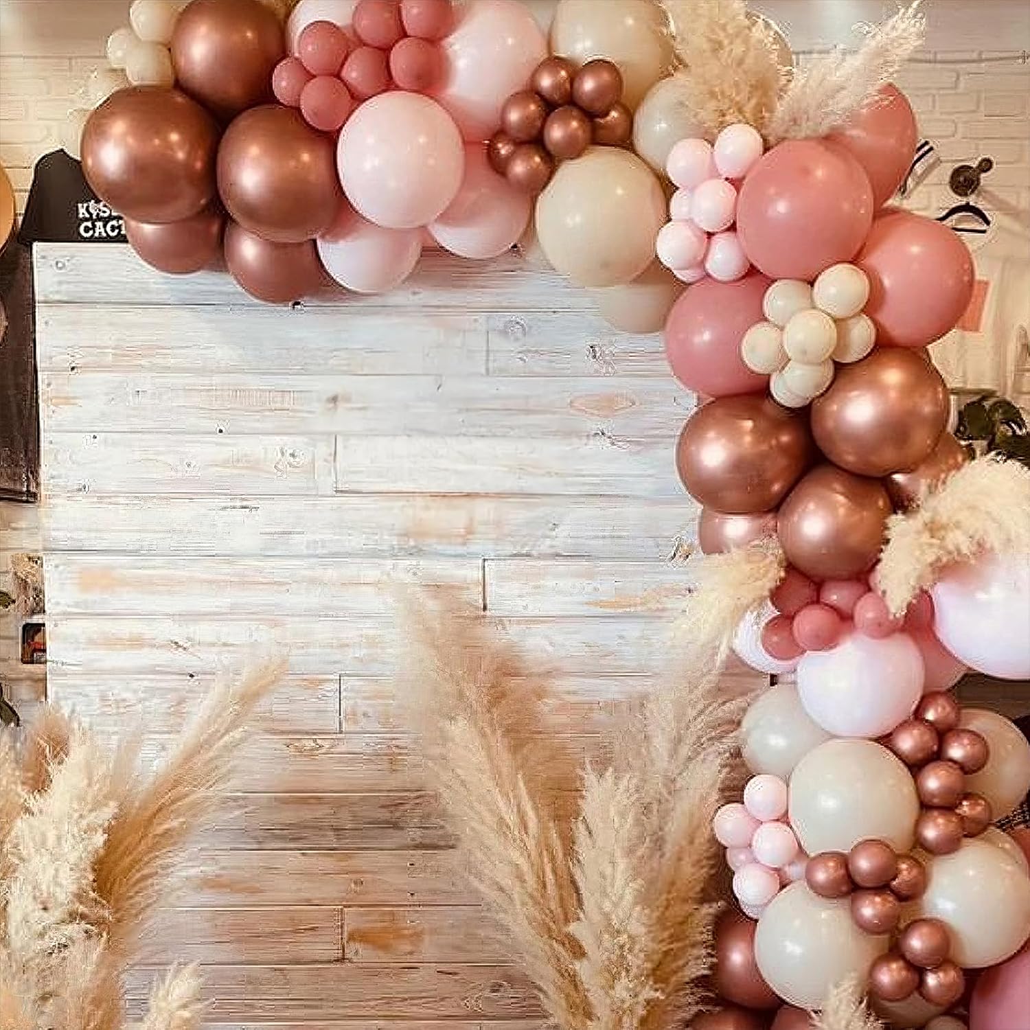 - 【Easy to Assemble】 Boho rose gold balloons can be inflated with air or helium. To save your time and energy, we recommend that you use an air pump to inflate them. You can use the silver ribbon we included to assemble the balloons into a nice rose gold pink balloon set.