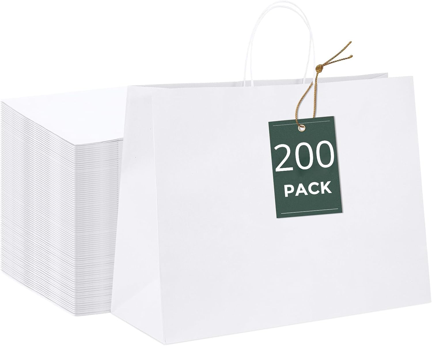 GSSUSA 16x6x12 Inches Large Paper Bags with Handles, 200Pc White Paper Gift Bag, Recyclable Shopping Bags Kraft Paper Bag for Small Business, Party Favor, Craft Bag for Boutique