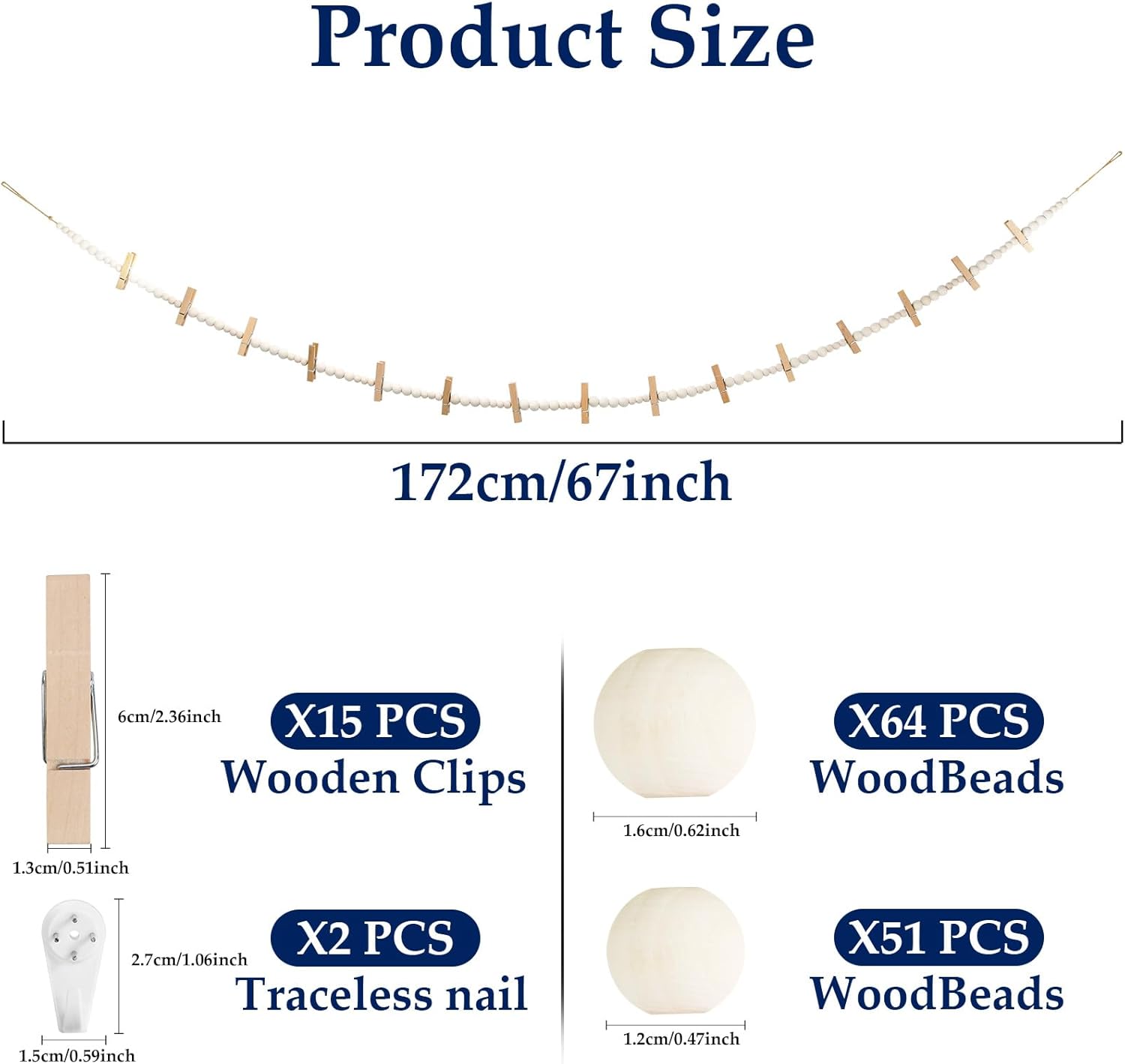 - 1 Pcs Boho Wood Beads Garland Size: The total length of the photo wall display is 67 inches. It features wooden beads of different sizes, with bead diameters of 0.47 inches and 0.63 inches, totaling 80 wooden beads. It is long enough to fit any home decor and makes a lovely addition to walls, shelves, beside mirrors, over fireplaces and sofas,and more.