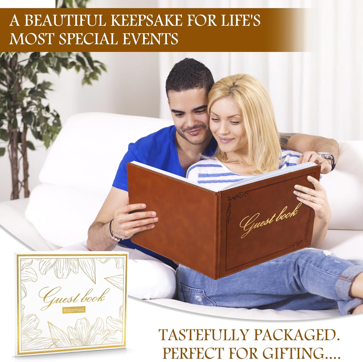 - ELEGANT DESIGN: Treasure your special day in our beautiful guest book. Measuring 8 x 10 inches, it comes with an exquisite PU leather cover, decorated with beautiful gold foil letters and crafted using advanced technology. The shimmering gold accents not only enhance the beauty of the guest book wedding reception, but also its overall quality, making it treasured keepsake for years to come