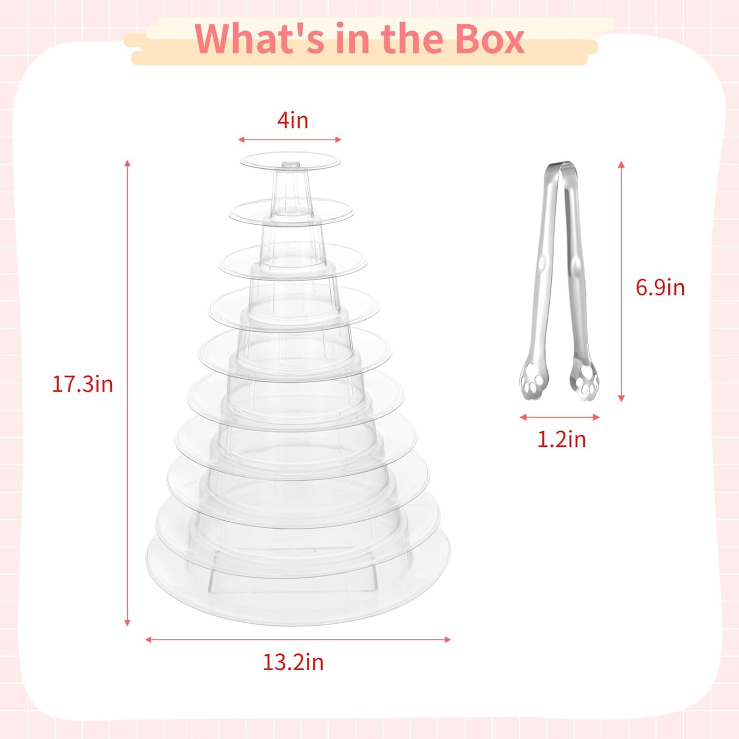 10-Tier Clear Macaron Display Stand, Plastic Macaron Tray Tower with Stainless Steel Serving Tongs, Clear Round Macaron Display Rack, Cupcake Dessert Stand for Weddings, Birthday Parties, Bakeries