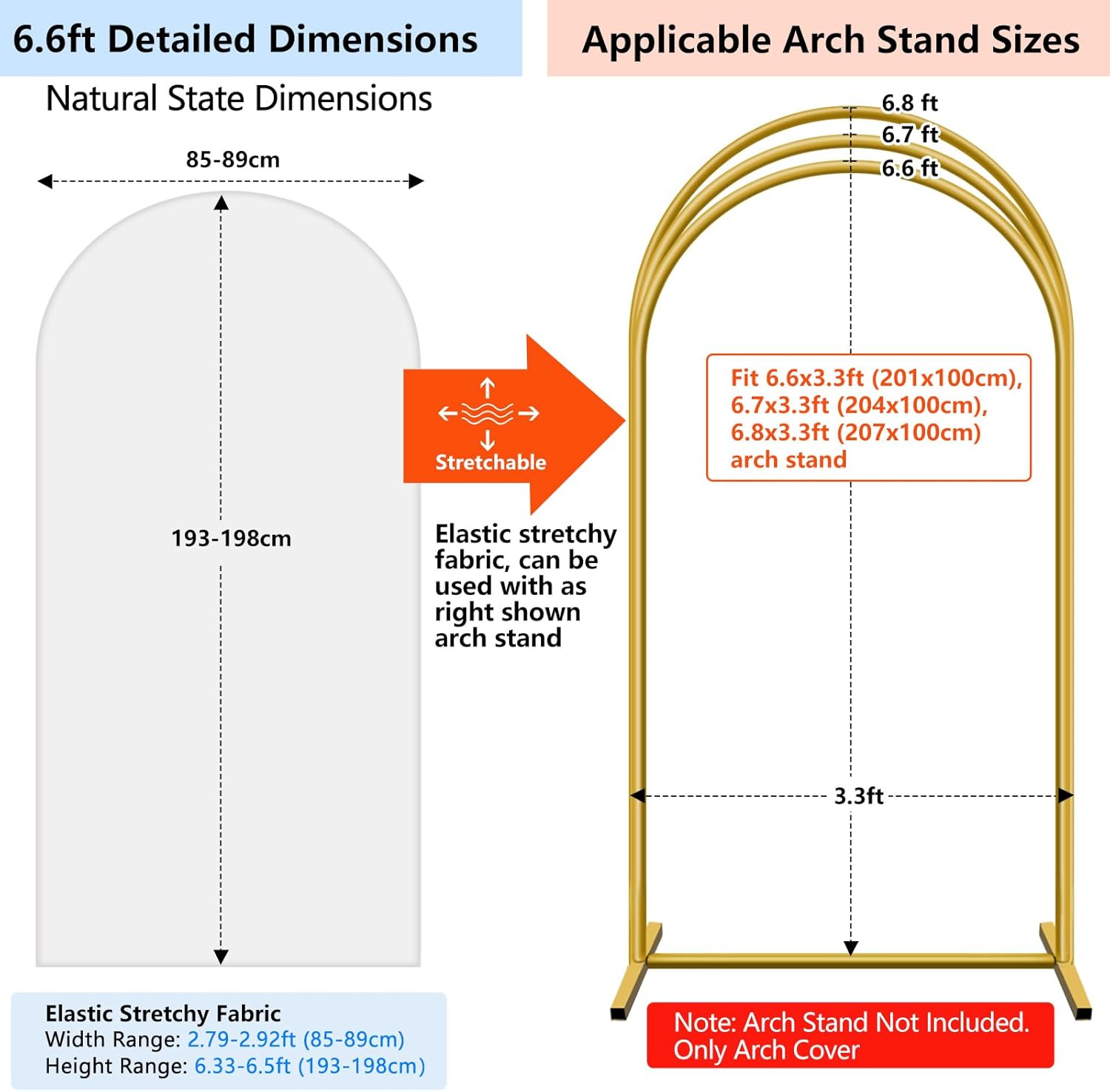 - Applicable Arch Stand Size: The arch cover has good elasticity, and the natural size range is 6.33-6.5 ft high and 2.79-2.92 ft wide. It can be used for arches with a height of 6.6 ft to 6.8 ft and a width of 3.3 ft. ⚠️ Note: Arch stand is not included