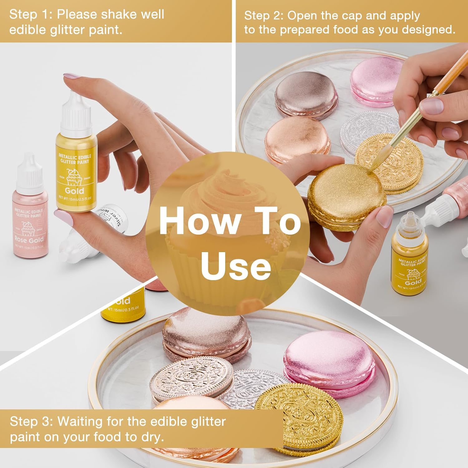 - Easy to Use: Open the bottle and just apply it directly with a brush for your dessert. Shake well before using, just a little bit of edible glitter cake paints is all you need to achieve the effect you want. You can add vodka or grain alcohol to dilute food paints if needed.