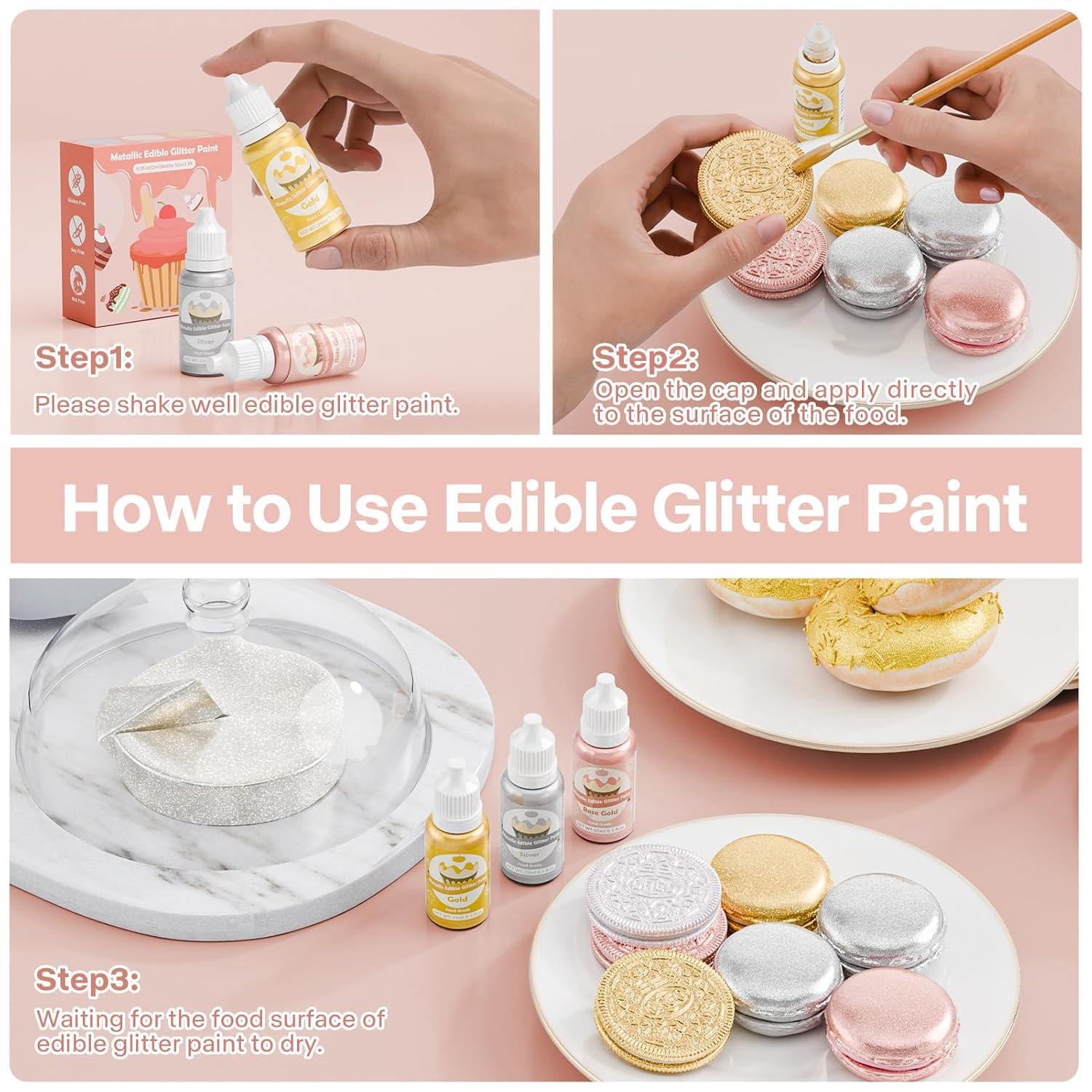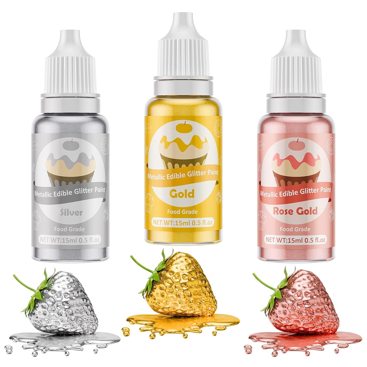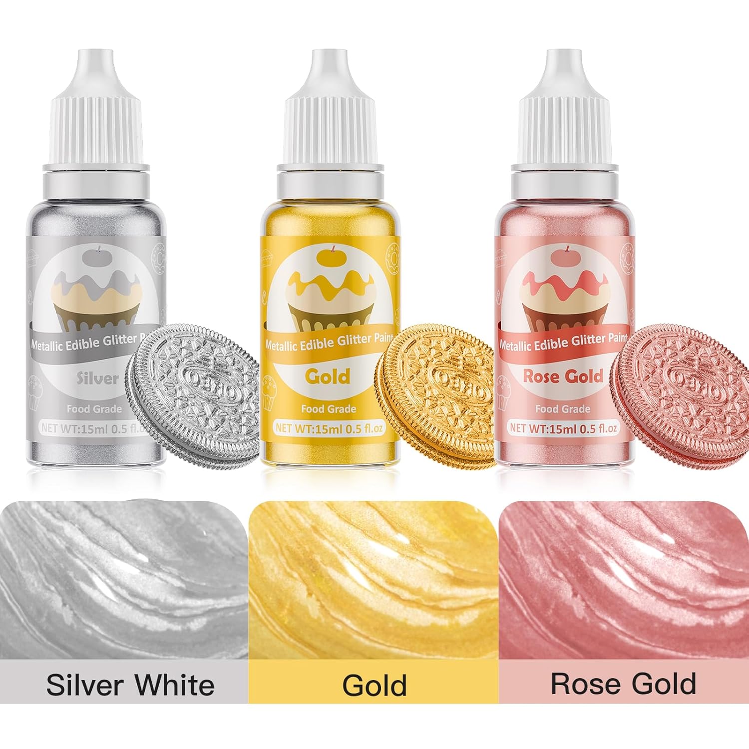- Metallic Edible Glitter Paint Set: Our cake paint is specially crafted for food and baking decoration to create a high luster glitter effect, perfect for adding a touch of metallic finish to your cake decorating projects. 3 vivid color can be choose: Gold, Rose Gold, Siliver. All colors looks amazing and beatiful!