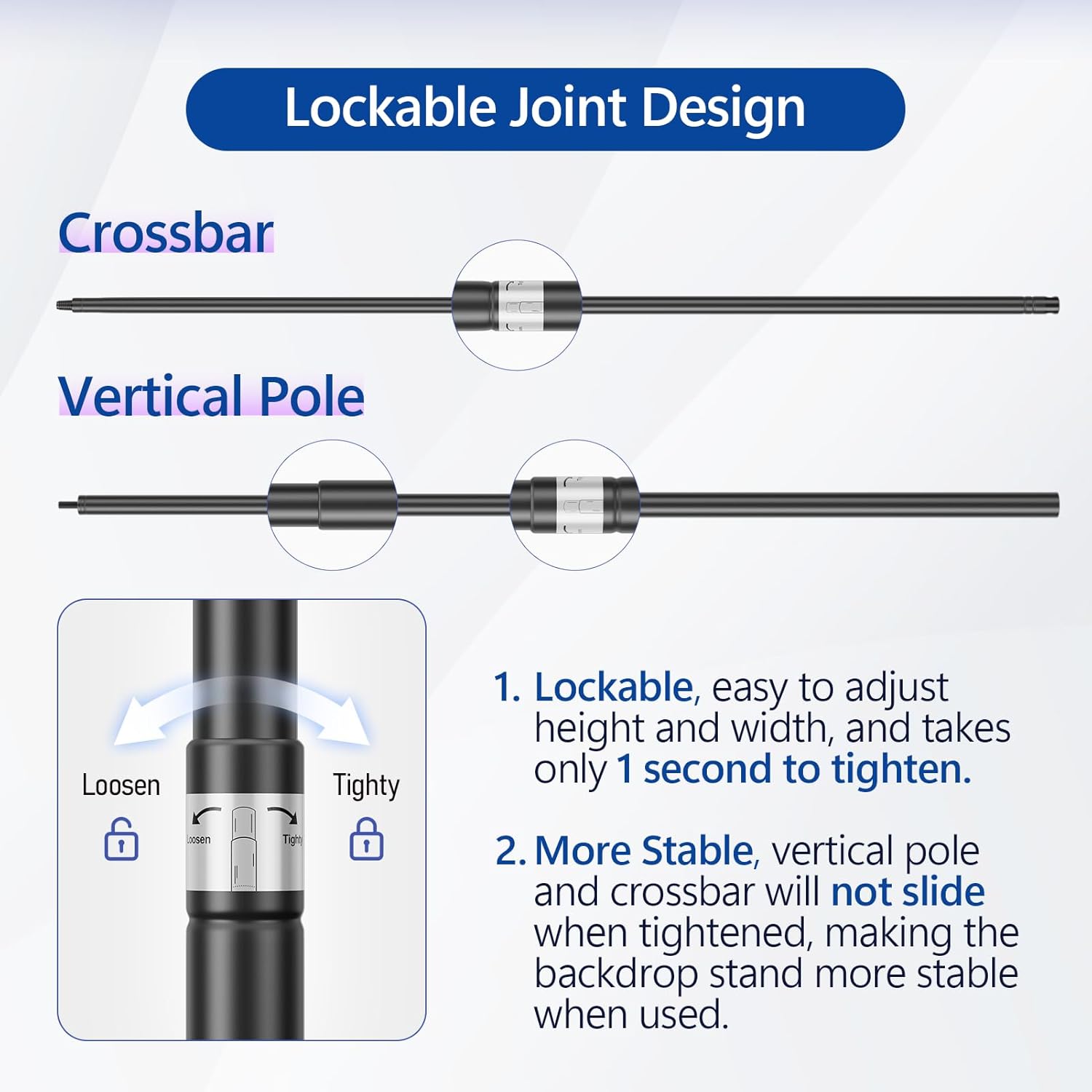 - 【Lockable Joint Design】1.Lockable, The back drop adjustable stand can easy to adjust height and width , and takes only 1 second to tighten. 2. More Stable, vertical pole and crossbar will not slide when tightened, making the photoshoot backdrop stand more stable when used