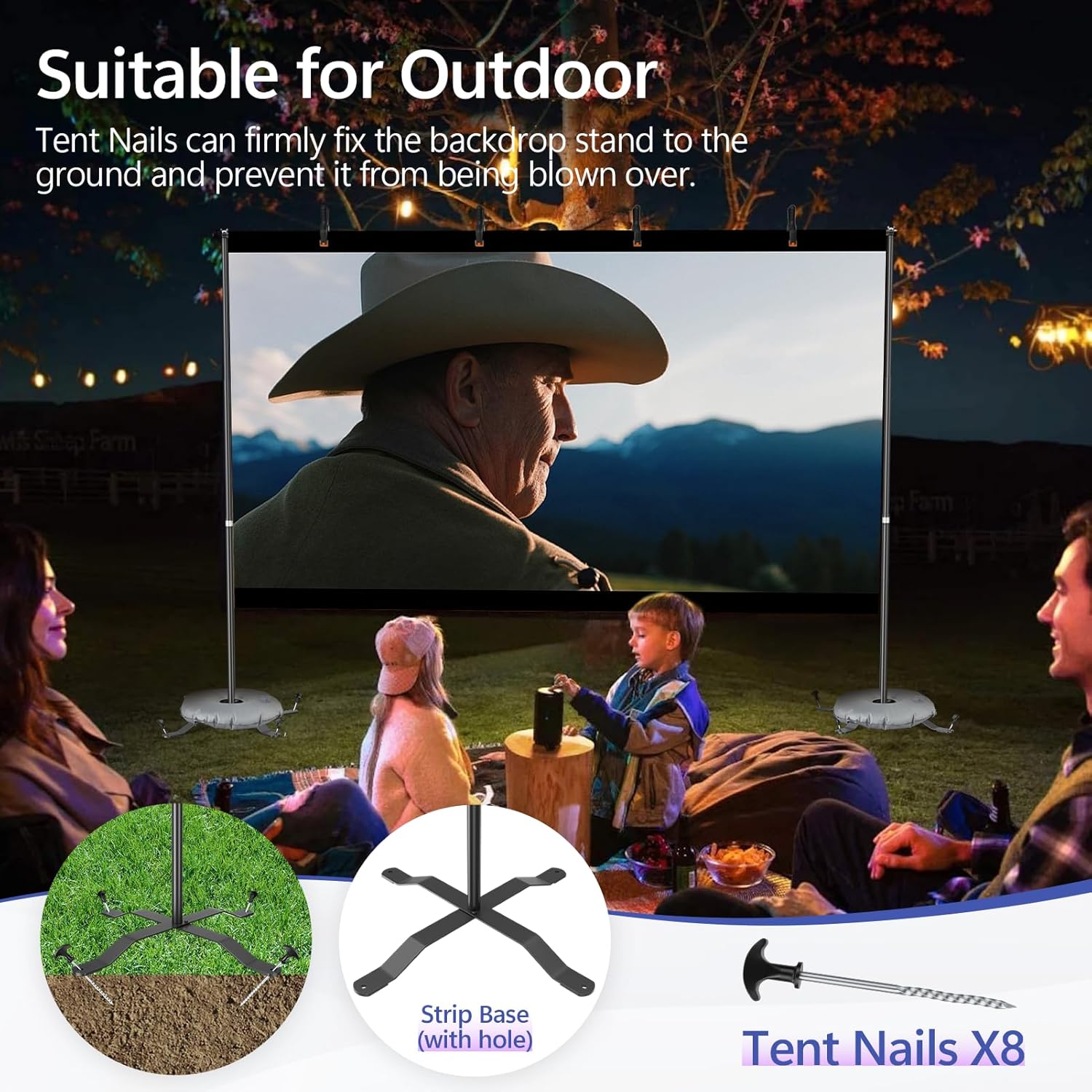 - 【More Suitable for Outdoor】Backdrop stand kit equipped with 8 tent nails that can be inserted into holes in the strip base, tent nails can firmly fix the Projector Screen stand to the ground and prevent it from being blown over. In addition, when used indoors, 2 water weight bags can be used to make the background support system kit more stable.