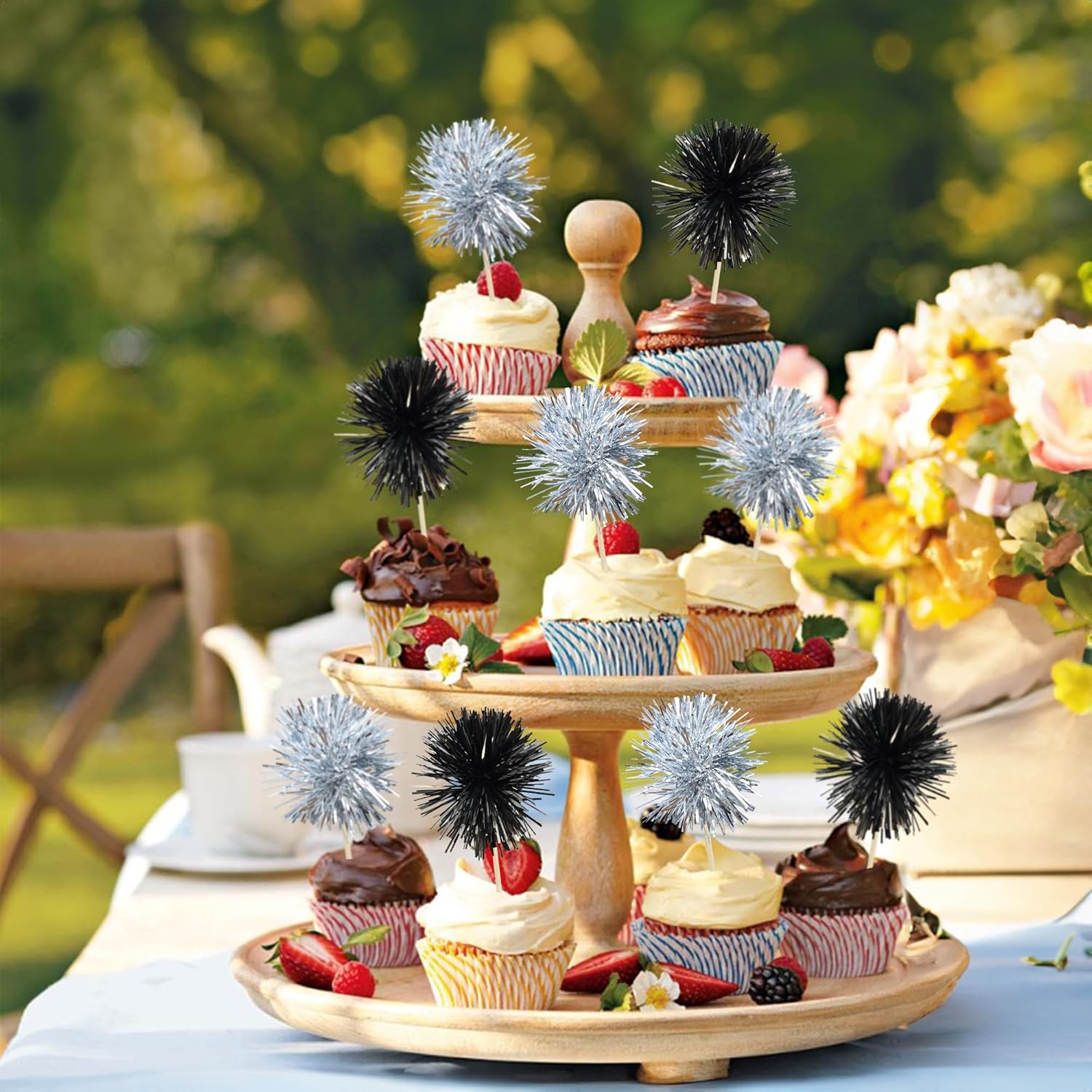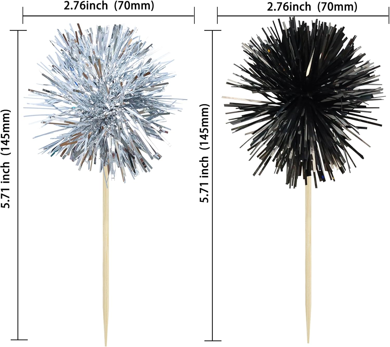 Gyufise 30Pcs Foil Firework Cupcake Toppers Sparkle Tinsel Cake Toppers Tinsel Drink Cake Decoration Cocktail Picks for Birthday Wedding Graduation Party Supplies Black Silver