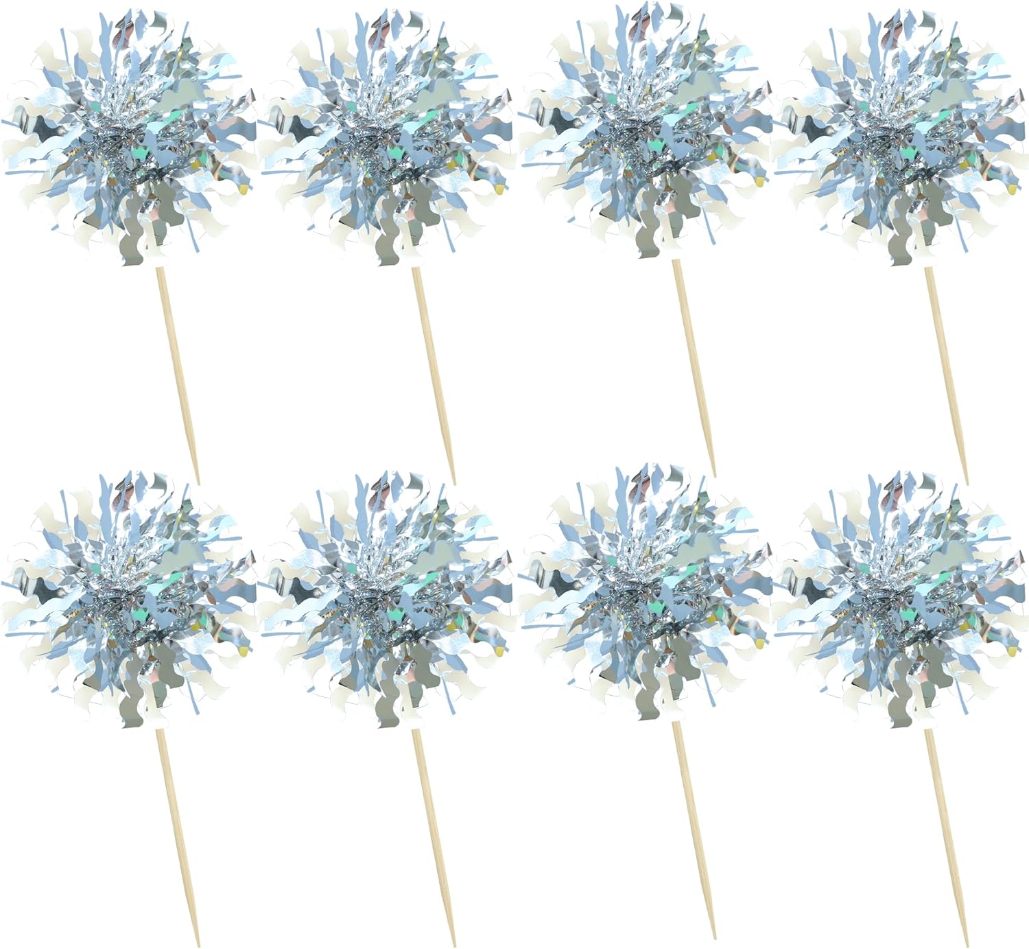 Ephlyn 30Pcs Foil Firework Cupcake Toppers Happy Birthday Cake Toppers Tinsel Flower Drink Stirrers Cocktail Food Fruit Toothpicks for Valentine's Day Party Decorations Silver