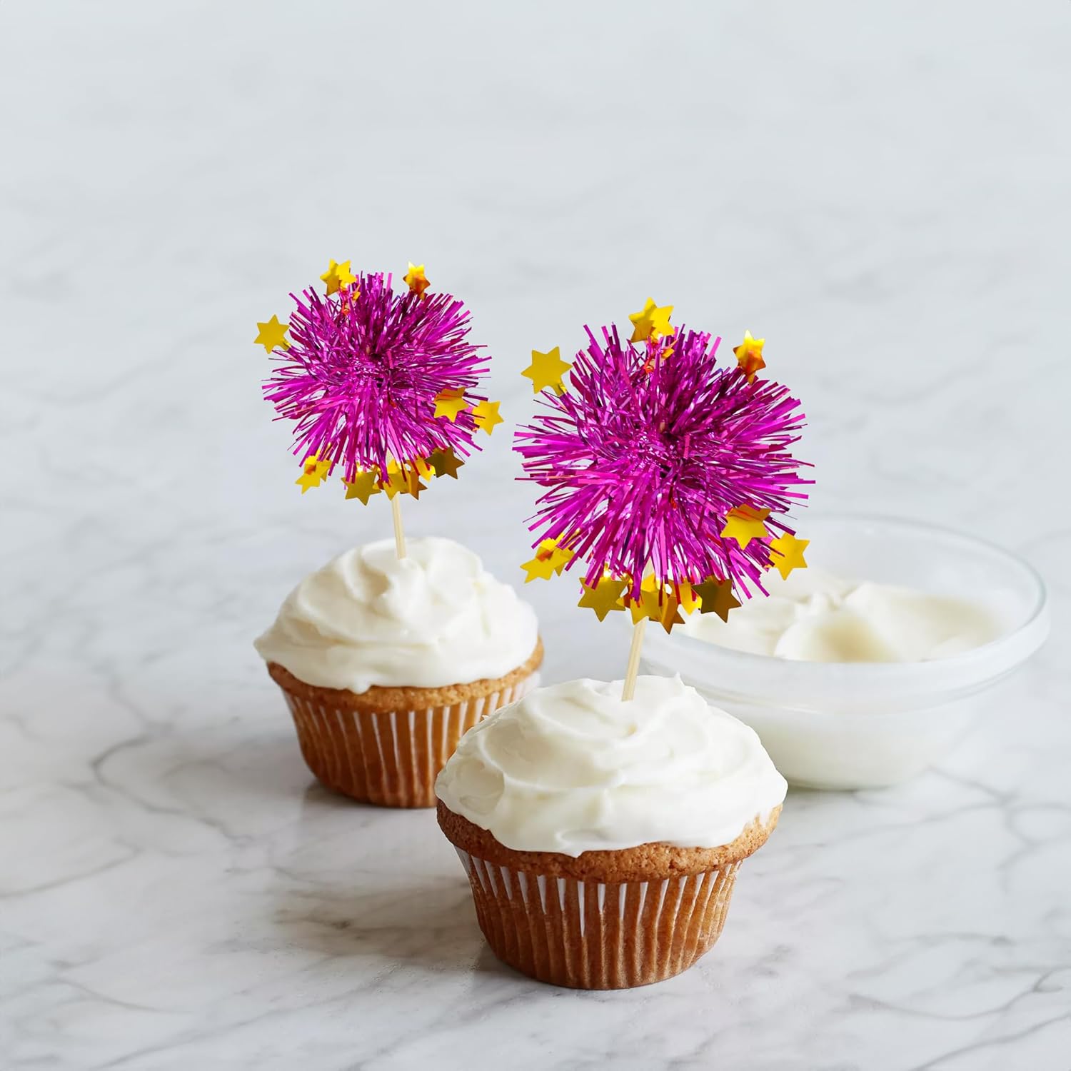 - 【NO Required】: 30Pcs Foil Firework cupcake toppers can put in the cake directly! These 30Pcs Foil Firework Cupcake toppers save your time and super easy to use. You can easily dress up your birthday theme cakes, yes! but don't stop there, put them into desserts, cookies, fruit pieces, appetizers, muffins and so much more!