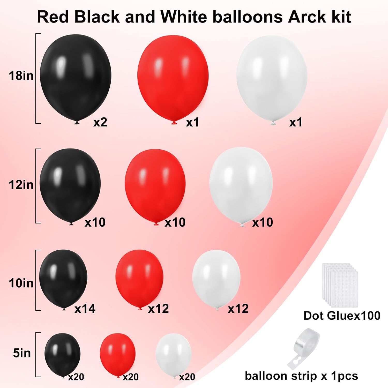 - 【Red Black and White Balloon Garland Arch Kit】These red and black balloons includes 132pcs different sizes of black balloons(18in*2, 12in*10, 10in*14, 5in*20), white balloons(18in*1, 12in*10, 10in*12, 5in*20), red balloons(18in*1, 12in*10, 10in*12, 5in*20), a roll of 16ft garland strip and glue dots. Perfect size and quantity of black and silver balloons to create best atmosphere in your party!