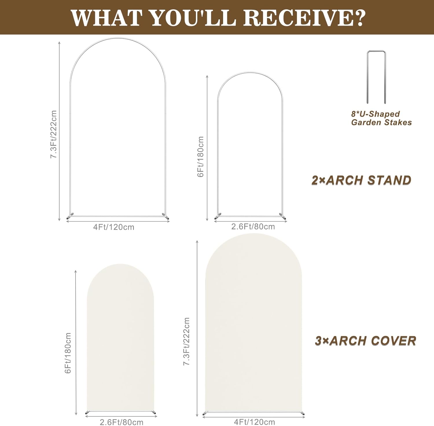 - Arch Backdrop Stand Set-Our Metal wedding arch backdrop stand set includes a 7.3x4 ft,6×2.6ft metal arch backdrop stand, and the same size arch backdrop cover, the metal arch frame is in an elegant door shape, providing excellent background decoration for your event