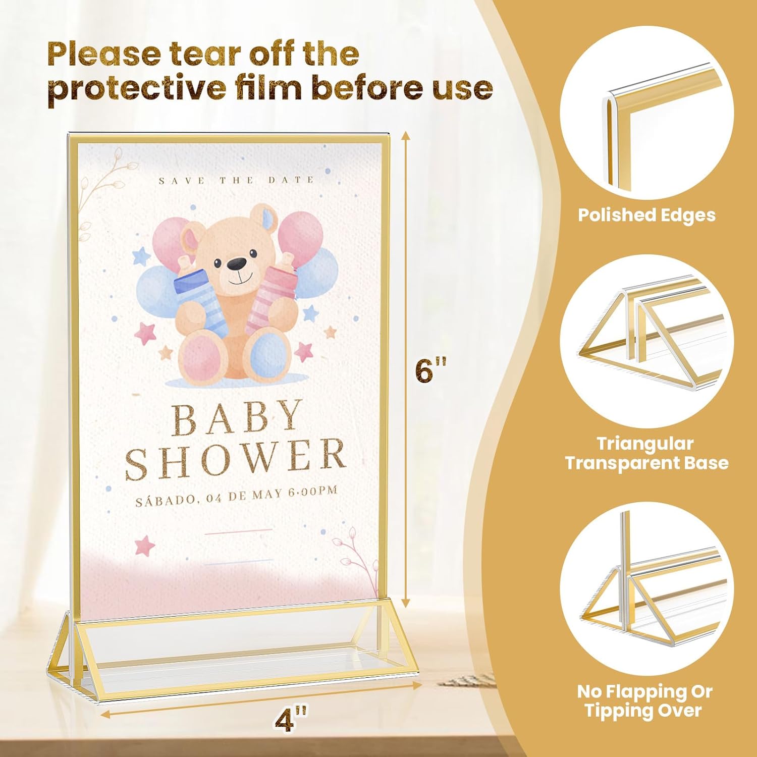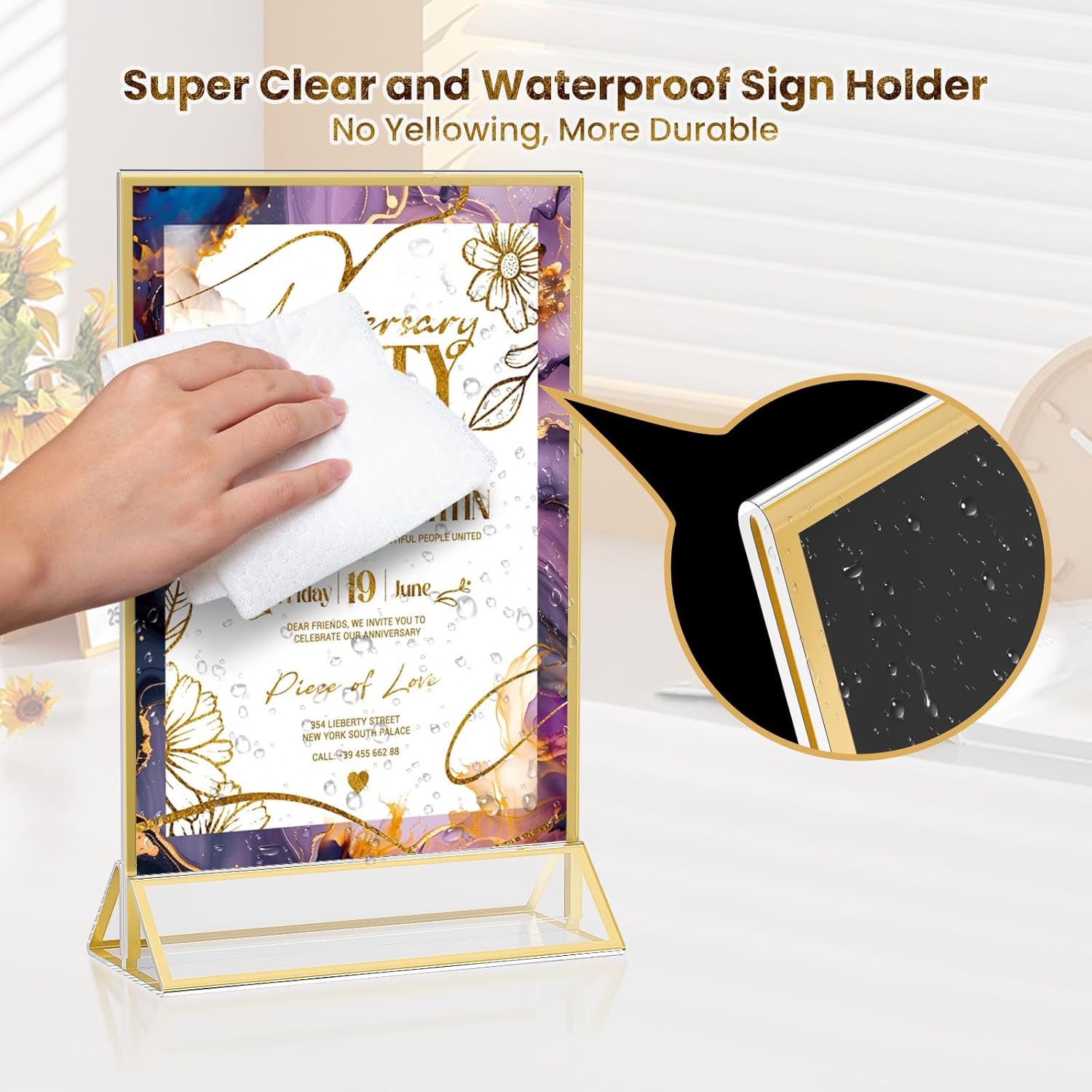 - 【EASY TO ASSEMBLE】These gold picture frames are incredibly easy to install. Simply open the double-sided display frame, place your sign inside, and insert the holder into the base. Plus, the detachable design makes them convenient to store and transport, too.