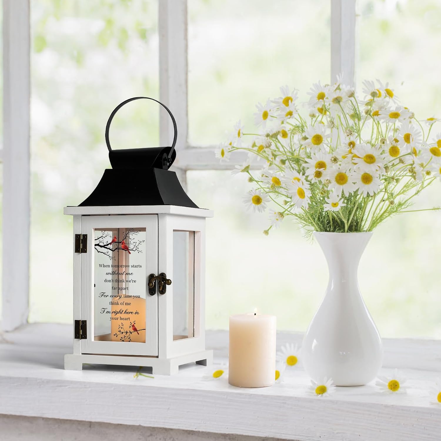 - Exquisite Design: Sympathy lanterns are made of solid wood and rust proof iron sheet, they are built to endure as a long-lasting tribute to a lost loved one. The glass sides allow the candlelight to shine through clearly, adding warmth and a touch of elegance to any room. The memorial text is printed in high definition via UV printing, and the text is clear and durable. The cardinal pattern on the glass makes us feel that our loved ones are close by.
