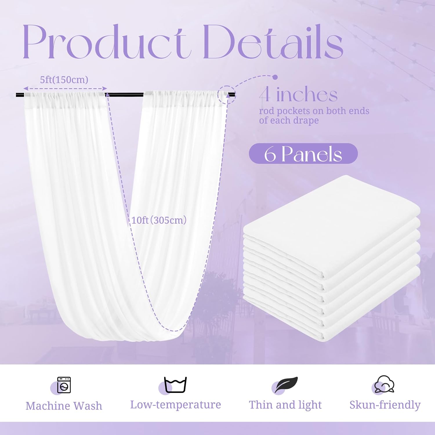 - 【Package Includes】The package will include 6 panels white wedding ceiling drapes (Not include stand), each wedding extra long curtain measures 5 feet (60inch)wide x 10 feet(120inch) long.The sufficient quantity can meet your demands for decorating your weddings, parties, receptions.