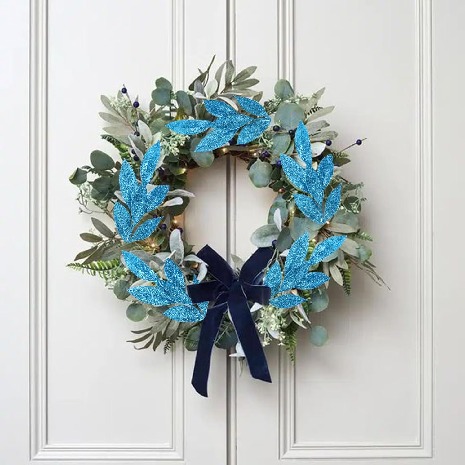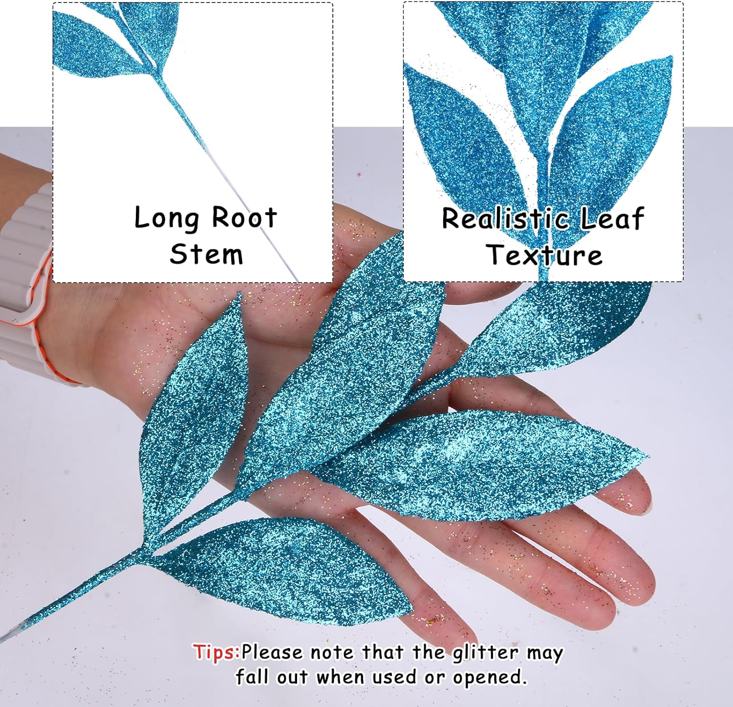 GREENTIME 12 Pack Artificial Blue Glitter Leaves 13" Fake Christmas Picks Decorative Glitter Sticks for Vase Christmas Tree DIY Wreath Crafts Fireplace Decor
