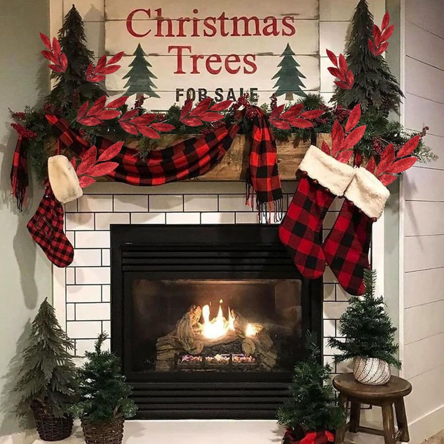 GREENTIME 12 Pack Artificial Red Glitter Leaves 13" Fake Christmas Picks Decorative Glitter Sticks for Vase Christmas Tree DIY Wreath Crafts Fireplace Decor