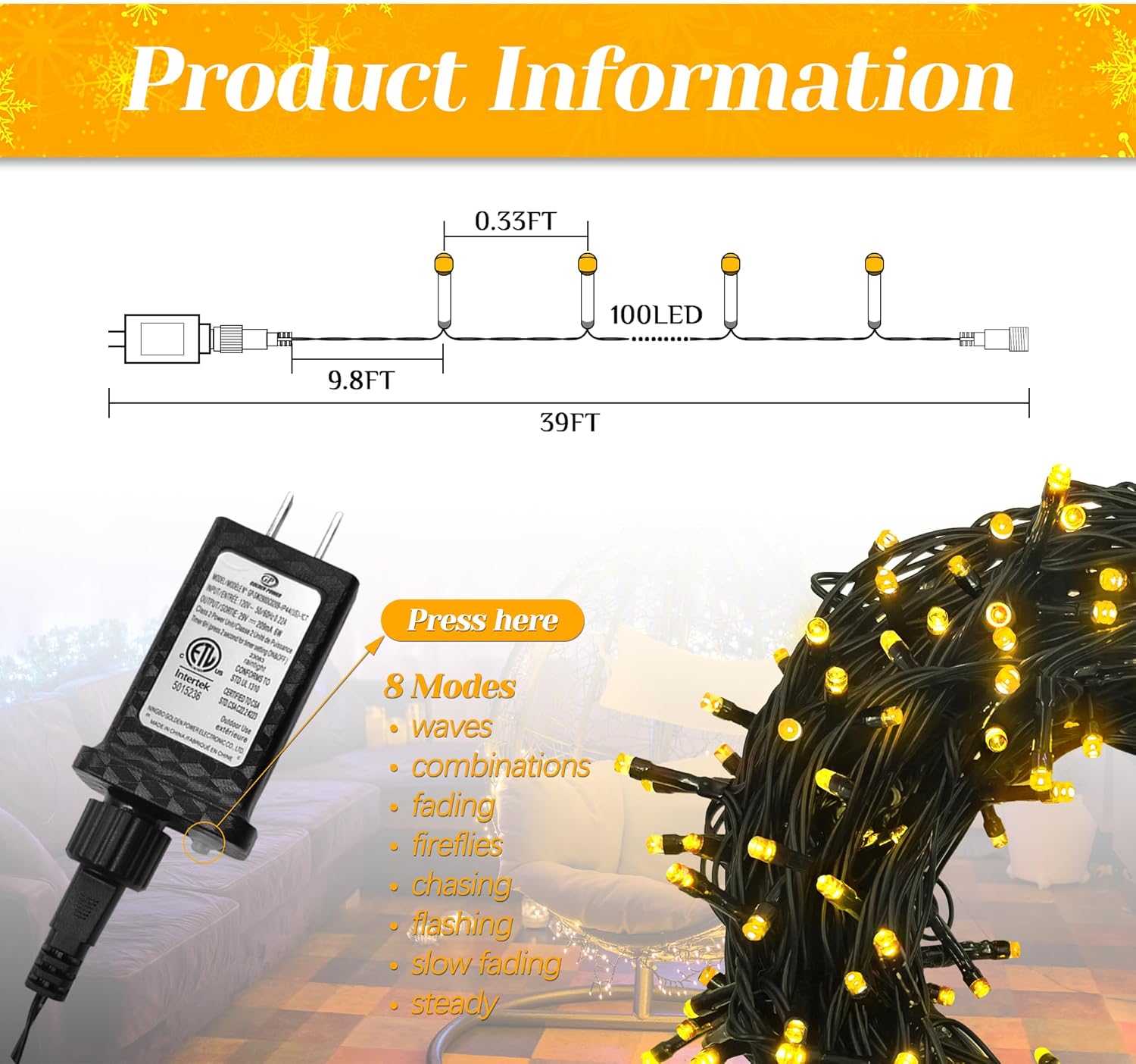 - [8 Modes]--The Christmas string lights has 8 different modes to choose from including Wave, Combination, Fade, Firefly, Chase, Twinkle, Slow Fade and Steady Lighting. Adjustable with the "Mode" button on the back of the plug, it also has a memory function so there is no need to reset.
