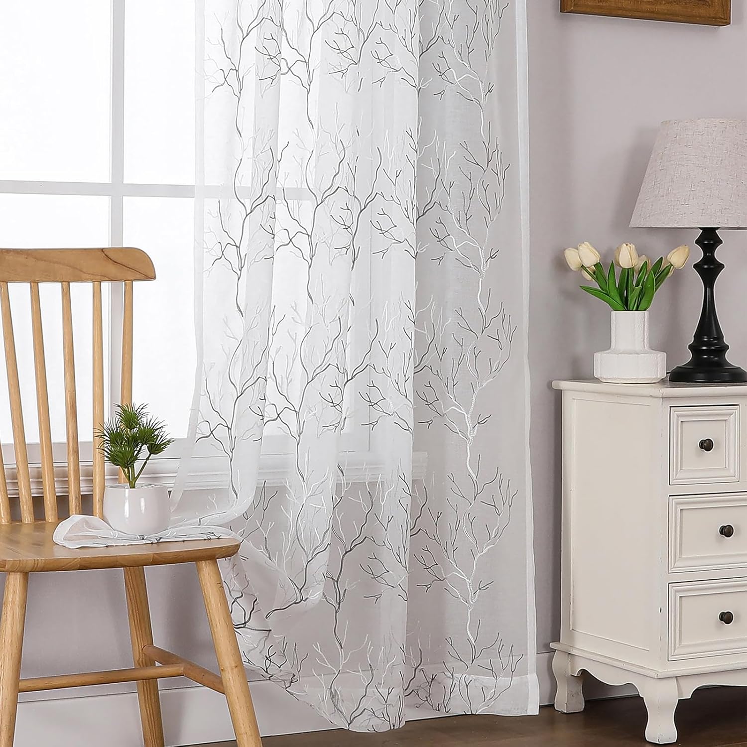 VISIONTEX Sheer Curtains 63 inch Length 2 Panels Set, Decorative Grey Coral Embroidery, Rod Pocket Embroidered Window Drapes for Living Room and Bedroom, 54" x 63"